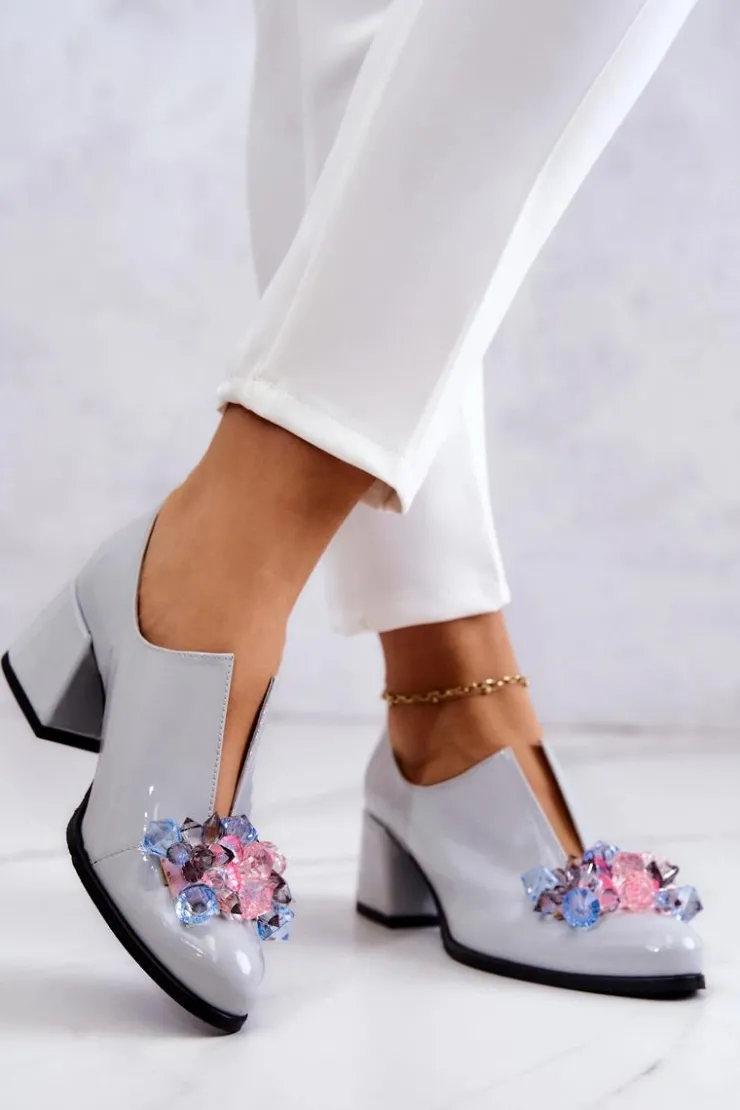 Damskie Boto Lakierowane Skórzane Półbuty Gładkie Z Ozdobą Szare Delaver