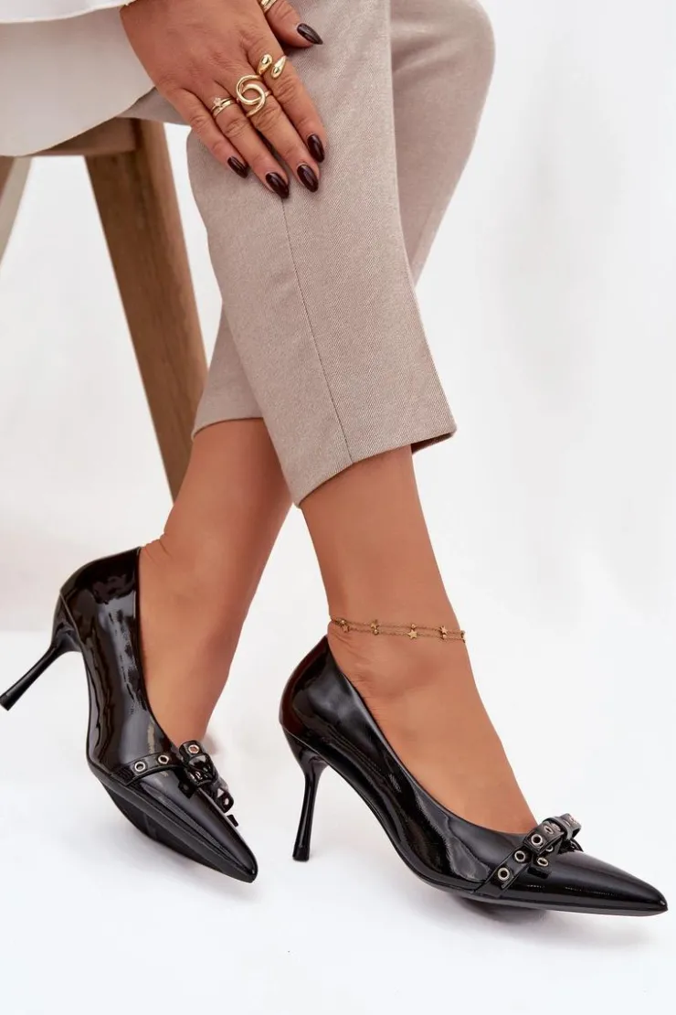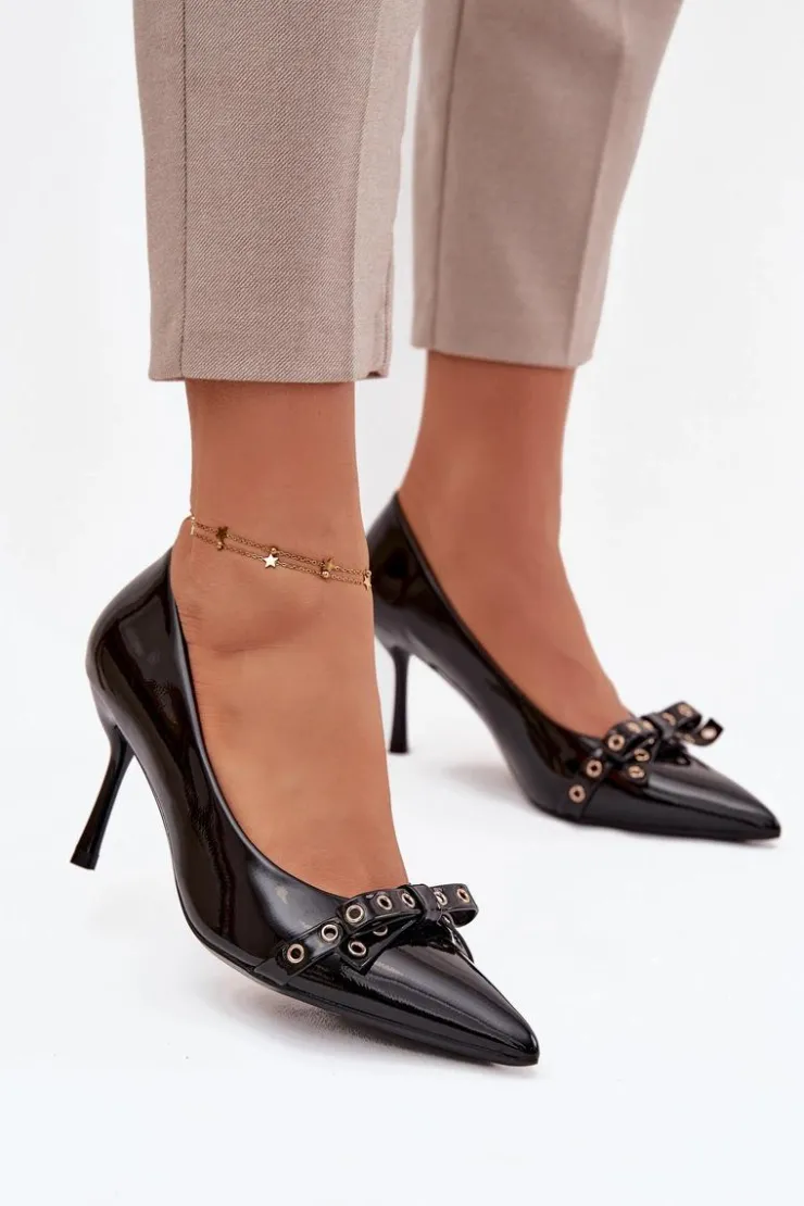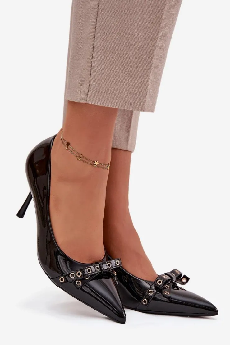 Klasyczne i pełne uroku szpilki wykonane z lakierowanej eko skóry to propozycja dla kobiet, które cenią elegancję i ponadczasowy styl. Błyszczące wykończenie dodaje im szyku, a szpiczasty nosek pięknie wysmukla nogi i podkreśla kobiecą sylwetkę. Na przodzie znajduje się ozdoba w formie delikatnej kokardki, która nadaje butom subtelnego, romantycznego charakteru. Smukła szpilka dodaje lekkości i elegancji, a jednocześnie zapewnia wyjątkowy wygląd przy każdej okazji. Te szpilki doskonale sprawdzą się zarówno do wieczorowych kreacji, jak i eleganckich stylizacji biurowych – zawsze wtedy, gdy chcesz wyglądać stylowo i czuć się wyjątkowo.