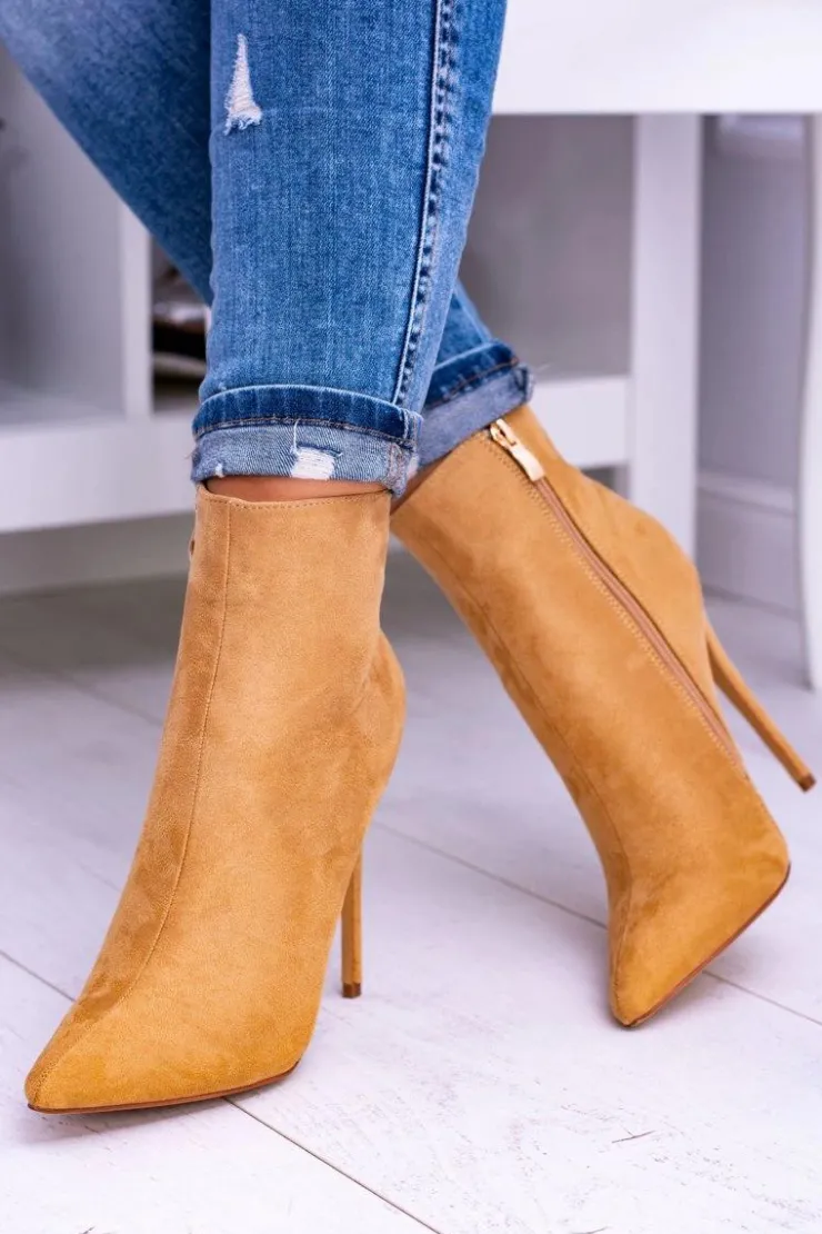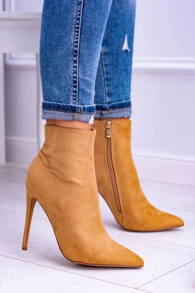 Damskie Boto Lu Boo Zamszowe Botki na Szpilce Camel Veneci