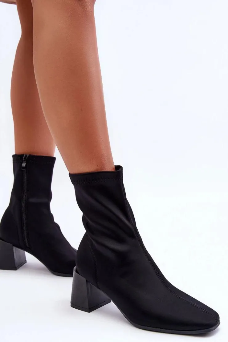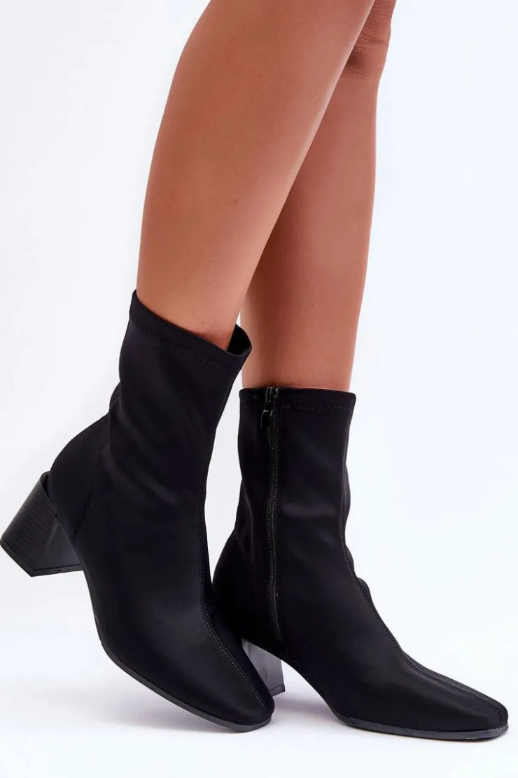 Botki damskie z materiałową cholewką z pewnością sprawdzą się w wielu stylizacjach! Zostały osadzone na niewysokim obcasie w postaci słupka. Na boku cholewki znajduje się zamek ułatwiający zakładanie obuwia. Dodatkowo botki posiadają usztywniany zapiętek. Wkładka w tym obuwiu została wykonana z eko skóry. Przy wyborze rozmiaru prosimy sugerować się tabelą rozmiarów.