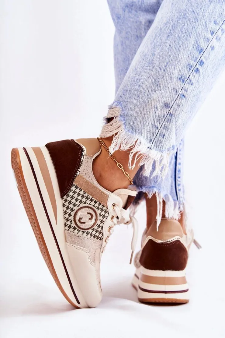 Wygodne sportowe buty damskie zostały wykonane połączenia kilku tkanin, m.in.: eko skóry oraz eko zamszu. Model ten posiada ozdobny emblemat wyszyty na boku cholewki. Buty posiadają delikatnie usztywniany zapiętek. Klasycznie sznurowane. Osadzone na platformie oraz koturnie. Dodatkowo podeszwa jest wykonana z gumowego tworzywa, antypoślizgowa. Przy wyborze rozmiaru prosimy kierować się tabelą rozmiarów.