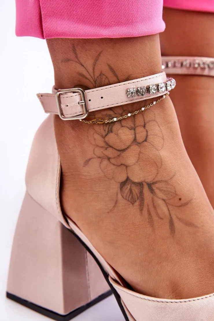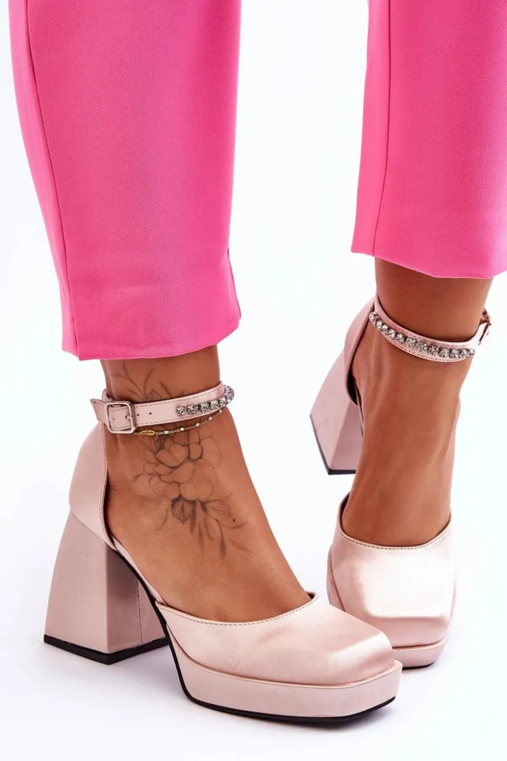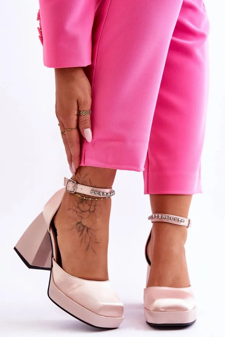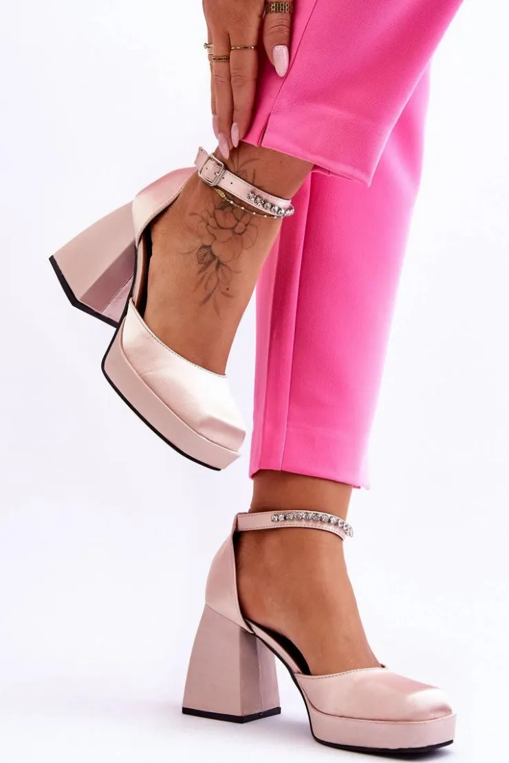 Czółenka zostały wykonane z materiału tekstylnego. Osadzone na platformie oraz obcasie w postaci stabilnego, masywnego klocka. Miękka wkładka z eko skóry zapewni komfortowe użytkowanie. Czółenka są zapinane na regulowany pasek ze sprzączką, który został dodatkowo ozdobiony dżetami imitującymi cyrkonie. Zapiętek został usztywniony. Przy wyborze rozmiaru prosimy sugerować się tabelą rozmiarów.