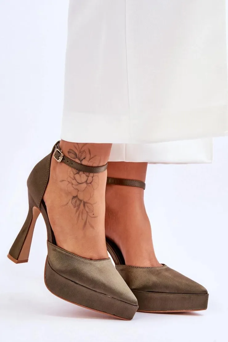 Modne czółenka na obcasie w postaci rozszerzonej ku dołowi szpilce oraz masywnej platformie z pewnością przypadną do gustu kobietom kochającym wysokie obcasy! Wierzch obuwia został wykonany z materiału tekstylnego imitującego satynę. Miękka wkładka z eko skóry pozwoli na komfortowe użytkowanie. Czółenka są zapinane wokół kostki na sprzączkę z regulowanym paskiem. Przy wyborze rozmiaru prosimy kierować się tabelą rozmiarów