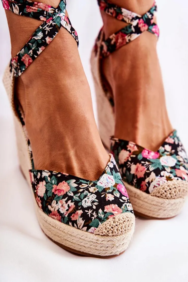 Sandały damskie osadzone na koturnie i platformie. Wykonane z tkaniny. Podeszwa jest gumowa i antypoślizgowa. Eko skórzana wkładka zadba o Twój komfort i wygodę. Zabudowane na nosku ażurową cholewką. Wiązane materiałowym paskiem wokół kostki. Sandały świetnie sprawdzą się w letnich stylizacjach. Przy wyborze rozmiaru prosimy sugerować się tabelą rozmiarów.
