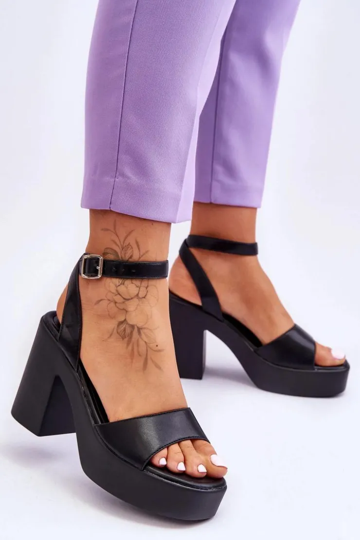 Damskie, modne sandałki zostały wykonane z eko skóry. Model ten posiada klasyczne zapinanie na regulowany pasek ze sprzączką. Sandałki osadzono na masywnej platformie oraz obcasie w postaci szerokiego słupka. Model ten posiada na przodzie szerszy paseczek. Miękka wkładka z eko skóry zapewni wygodne użytkowanie. Przy wyborze rozmiaru prosimy sugerować się tabelą rozmiarów.