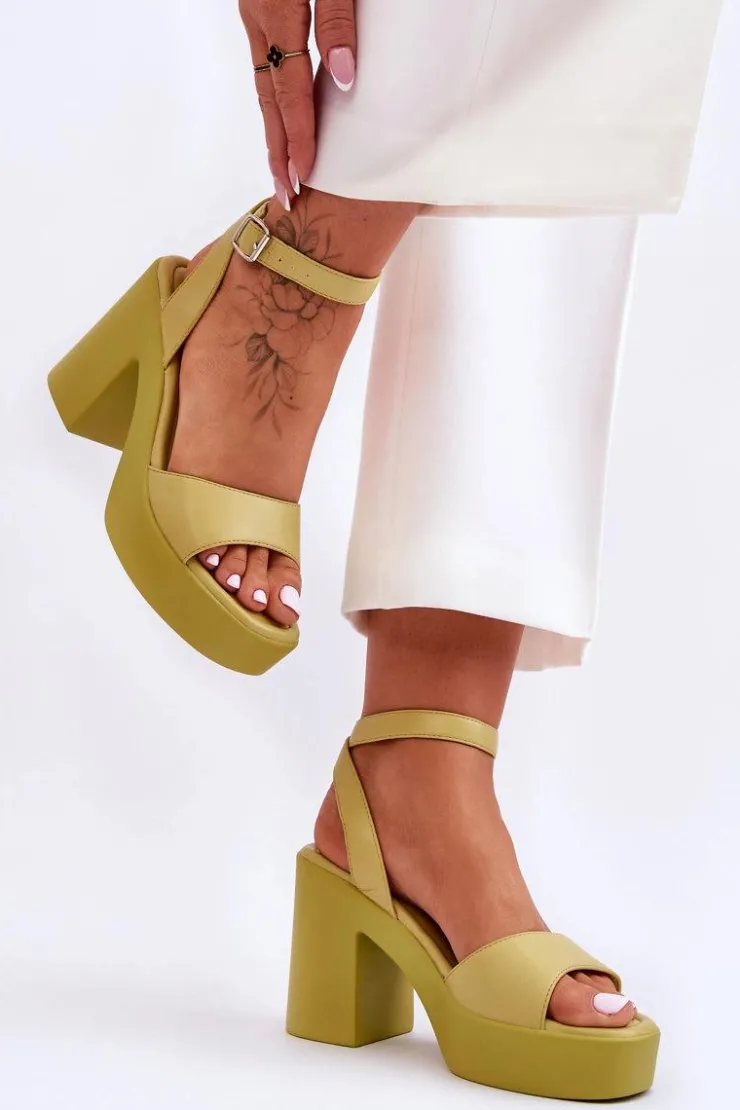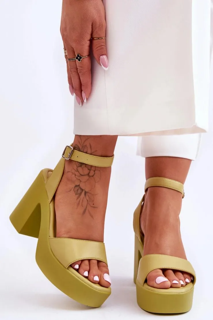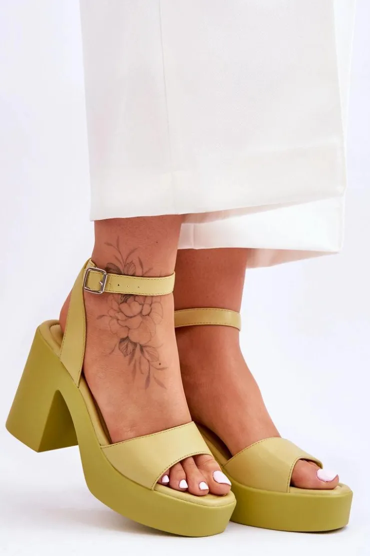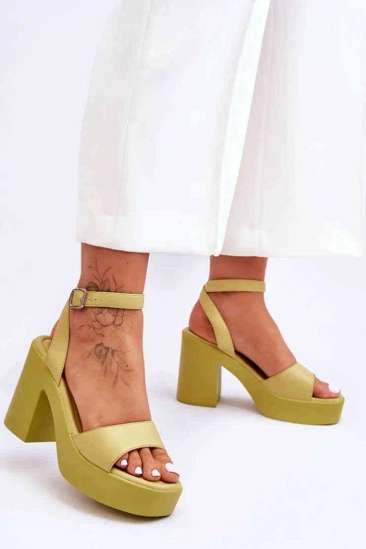 Damskie, modne sandałki zostały wykonane z eko skóry. Model ten posiada klasyczne zapinanie na regulowany pasek ze sprzączką. Sandałki osadzono na masywnej platformie oraz obcasie w postaci szerokiego słupka. Model ten posiada na przodzie szerszy paseczek. Miękka wkładka z eko skóry zapewni wygodne użytkowanie. Przy wyborze rozmiaru prosimy sugerować się tabelą rozmiarów.