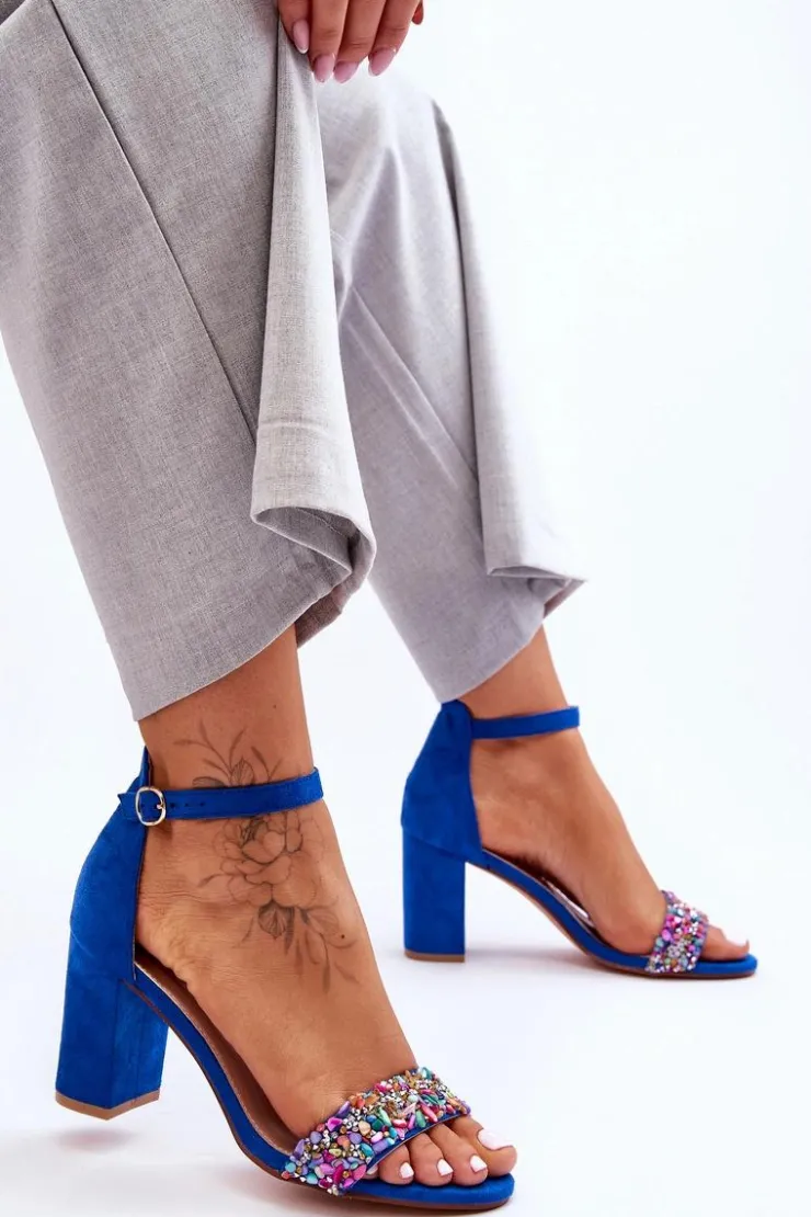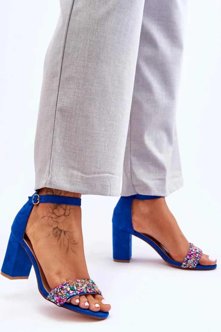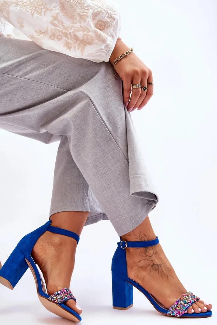 Modne sandały damskie zostały wykonane z miłego w dotyku eko zamszu. Osadzone na obcasie w postaci słupka. Paseczek na przodzie został ozdobiony modnymi kamieniami, co dodaje tym butom elegancji. Miękka wkładka z eko skóry zadba o Twój komfort podczas użytkowania. Model ten świetnie sprawdzi się na różnego rodzaju ważnych uroczystościach czy spotkaniach biznesowych. Przy wyborze rozmiaru prosimy sugerować się tabelą rozmiarów.