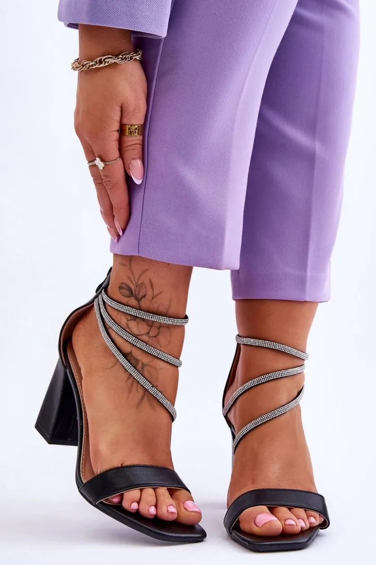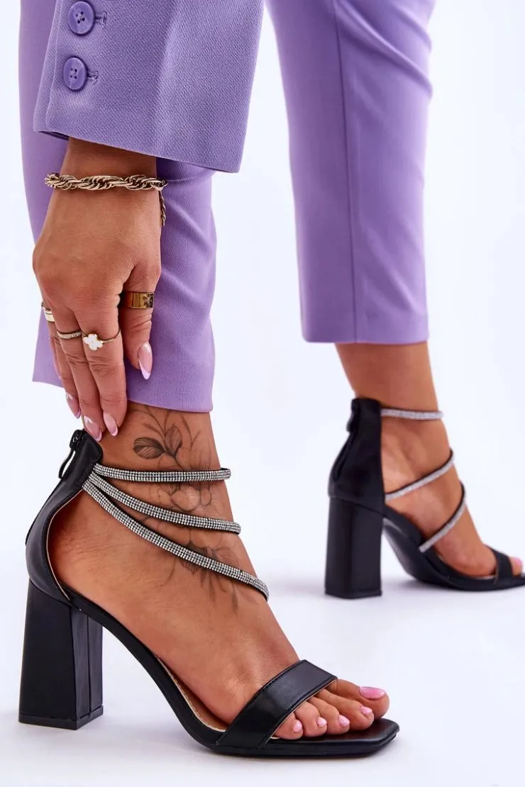 Cudne sandały na obcasie w postaci słupka zostały wykonane z eko skóry. Sandałki posiadają na wysokości kostki paseczki z dżetami imitującymi cyrkonie. Nosek odkryty, kwadratowy. Wkładka z eko skóry zapewni komfort podczas użytkowania. Model ten jest zapinany na suwak z tyłu cholewki. Sandałki z pewnością wykorzystasz do wielu stylizacji! Przy wyborze rozmiaru prosimy sugerować się tabelą rozmiarów.
