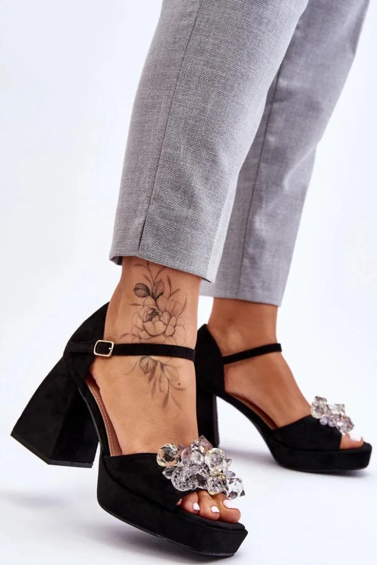 Eleganckie i modne sandałki zostały osadzone na masywnym obcasie w postaci słupka. Paseczek na przodzie został ozdobiony kryształkami. Miękka wkładka z eko skóry zadba o Twój komfort podczas użytkowania. Model ten świetnie sprawdzi się na różnego rodzaju ważnych uroczystościach. Ten fason to HIT, dlatego powinnaś mieć je w swojej szafie! Przy wyborze rozmiaru prosimy sugerować się tabelą rozmiarów.