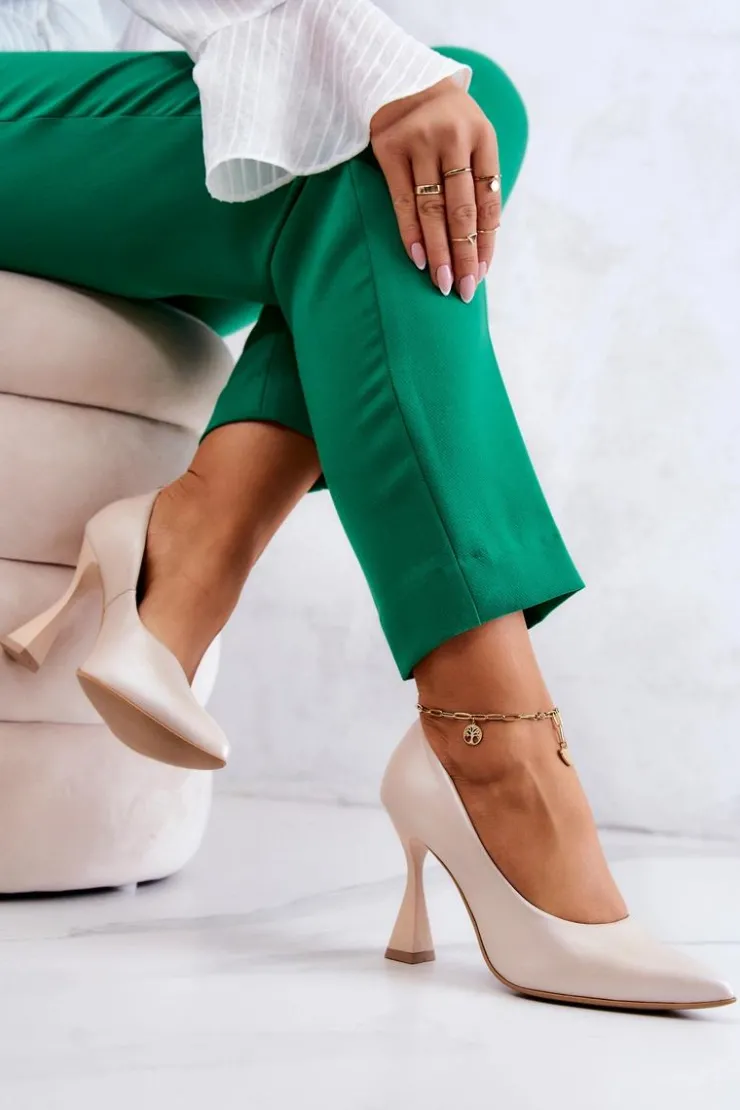 Te czółenka to HIT tego roku! Osadzone na modnym obcasie zwężanym ku górze i szerszym na dole. Buty zostały wykonane z wysokiej jakości naturalnej skóry. Nosek w szpic. Ten fason jest stabilniejszy od klasycznych szpilek, dzięki nowoczesnemu obcasowi. Wkładka wykonana z naturalnej skóry jest bardzo miękka i komfortowa w użytkowaniu. Czółenka te idealnie sprawdzą się na uroczystościach rodzinnych, spotkaniach biznesowych czy randce! Przy wyborze rozmiaru prosimy kierować się tabelą rozmiarów