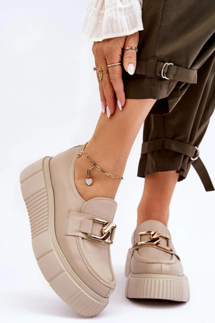 Damskie Boto Modne Skórzane Półbuty Na Platformie Beżowe Lemar Marsol