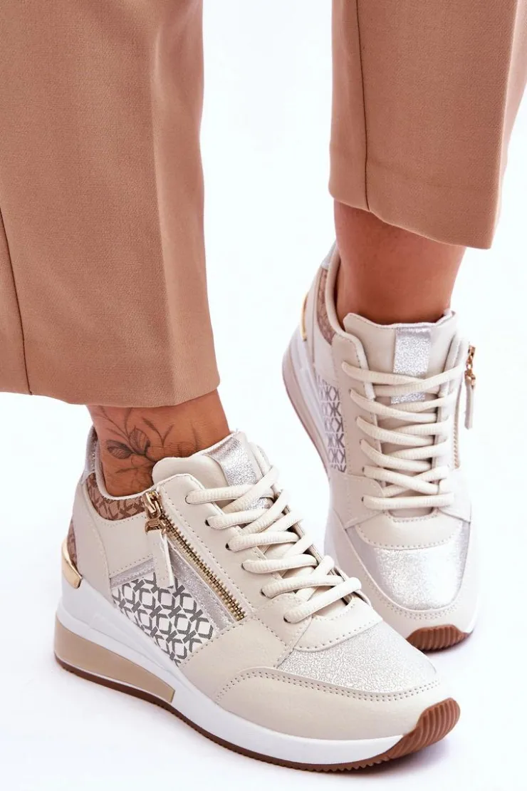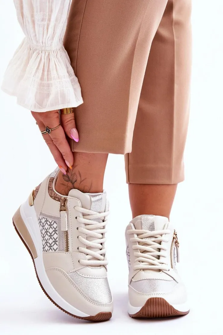 Modne, damskie buty sportowe zostały wykonane z eko skóry. Posiadają lustrzany element przy obcasie oraz ozdobny, odpinany zamek. Model ten został osadzony na koturnie z platformą. Buty posiadają klasyczne sznurowanie. Miękka wkładka w tych butach jest materiałowa. Zapiętek w tych butach jest delikatnie usztywniany. Przy wyborze rozmiaru prosimy kierować tabelą rozmiarów.