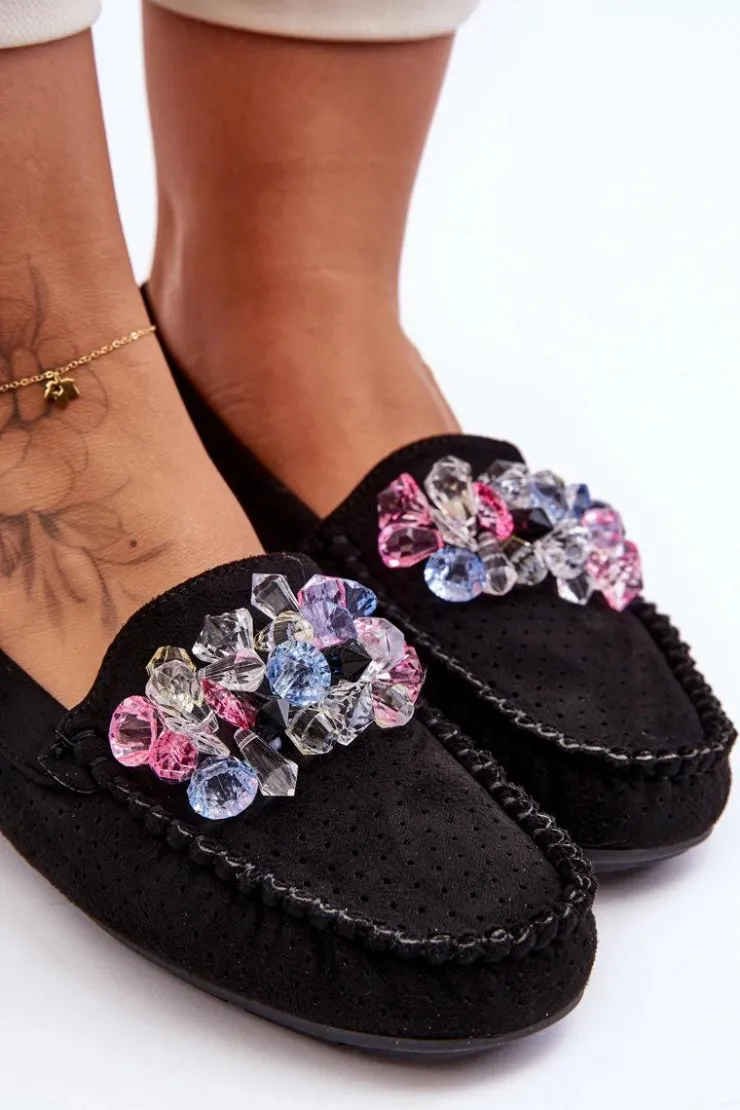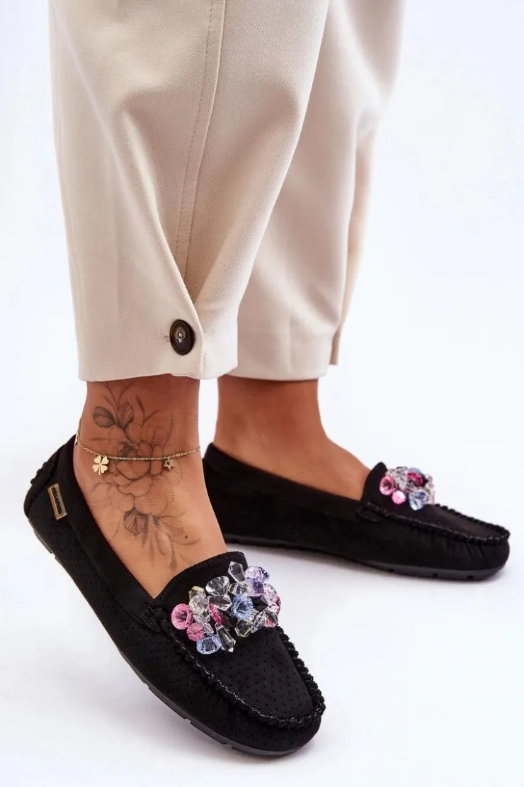 Te damskie mokasyny to HIT! Wykonane z miłego w dotyku eko zamszu z perforacją na całości cholewki. Na przodzie znajdują się ozdoby w postaci kolorowych kamieni. Mokasyny osadzono na antypoślizgowej, gumowej podeszwie. Miękka wkładka z naturalnej skóry i pianki zapewni komfort podczas użytkowania obuwia. Dodatkowo jest delikatnie perforowana. Przy wyborze rozmiaru prosimy sugerować się tabelą rozmiarów.
