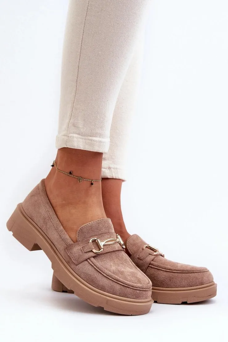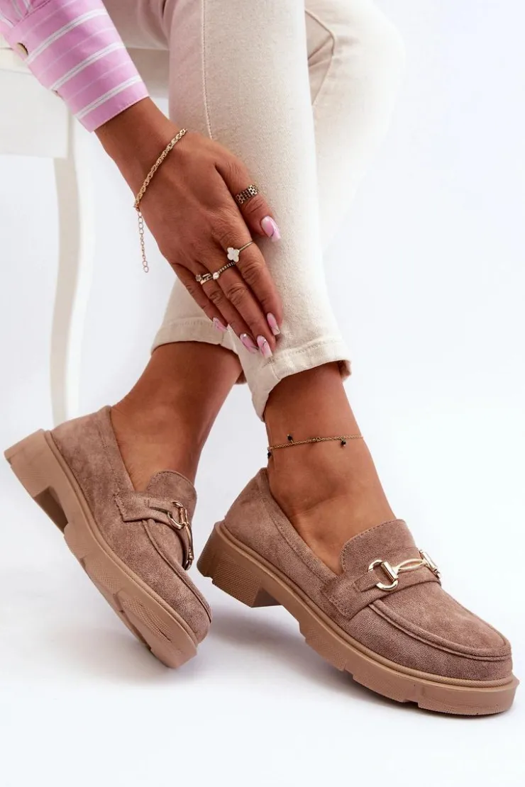 Modne damskie mokasyny wykonane z eko zamszu to absolutny must-have w Twojej garderobie! Przód ozdobiony paseczkiem ze złotą ozdobą, która dodaje im wyjątkowego uroku. Płaski obcas zapewnia wygodę noszenia przez cały dzień. Model ten będzie pasować do różnych stylizacji, dodając im elegancji! Przy wyborze rozmiaru prosimy sugerować się tabelą rozmiarów.