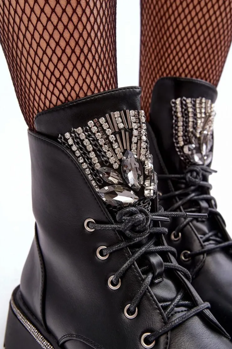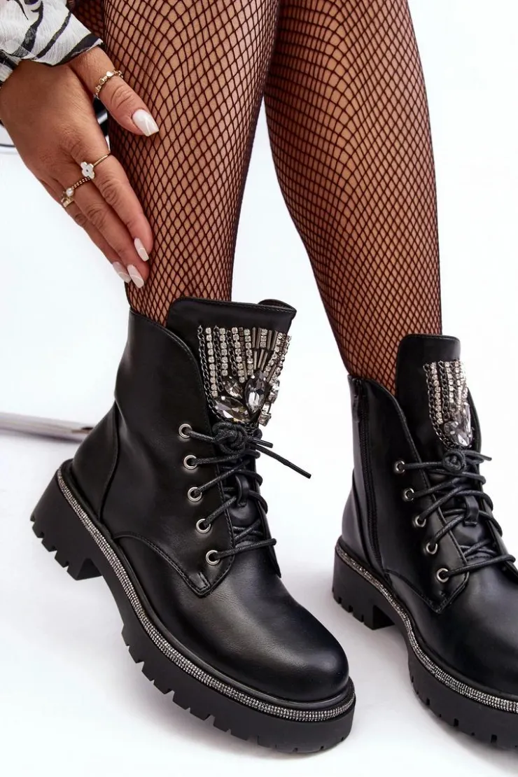 Botki damskie z cholewką za kostkę. Osadzone na płaskim, stabilnym obcasie oraz platformie. Wewnątrz ocieplone kocem obuwniczym. Na języku biżuteryjna ozdoba. Model sznurowany oraz dodatkowo zapinany na suwak z boku. Noski zaokrąglone. Usztyniony zapiętek. To świetne botki na jesień i zimę! Będą pasować do wielu stylizacji. Przy wyborze rozmiaru prosimy sugerować się tabelą rozmiarów.