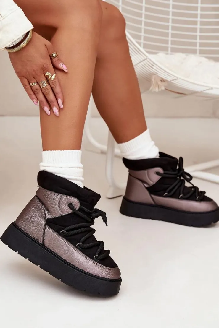 Damskie niskie śniegowce wykonane z połączenia eko zamszu i eko skóry to świetny wybór na zimowe dni. Osadzone na platformie, zapewniają komfort i stabilność, a grube wiązanie z przodu dodaje im charakteru. Środek ocieplony grubym futerkiem gwarantuje ciepło nawet w najbardziej mroźne dni. Idealne na zimowe wyjazdy, spacery czy codzienne stylizacje, te śniegowce łączą funkcjonalność z modnym wyglądem. Przy wyborze rozmiaru prosimy sugerować się tabelą rozmiarów.