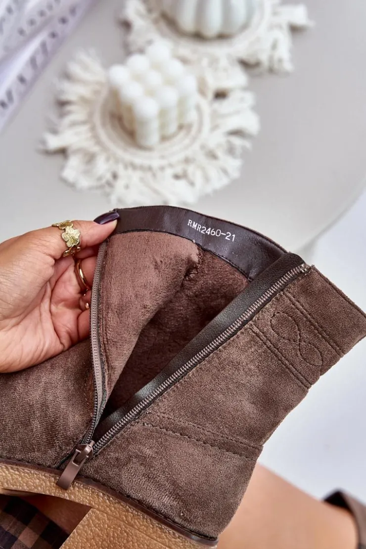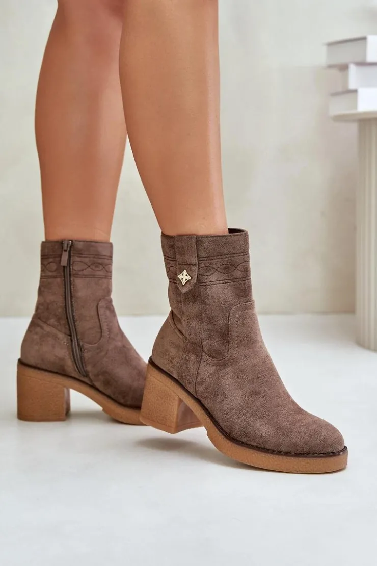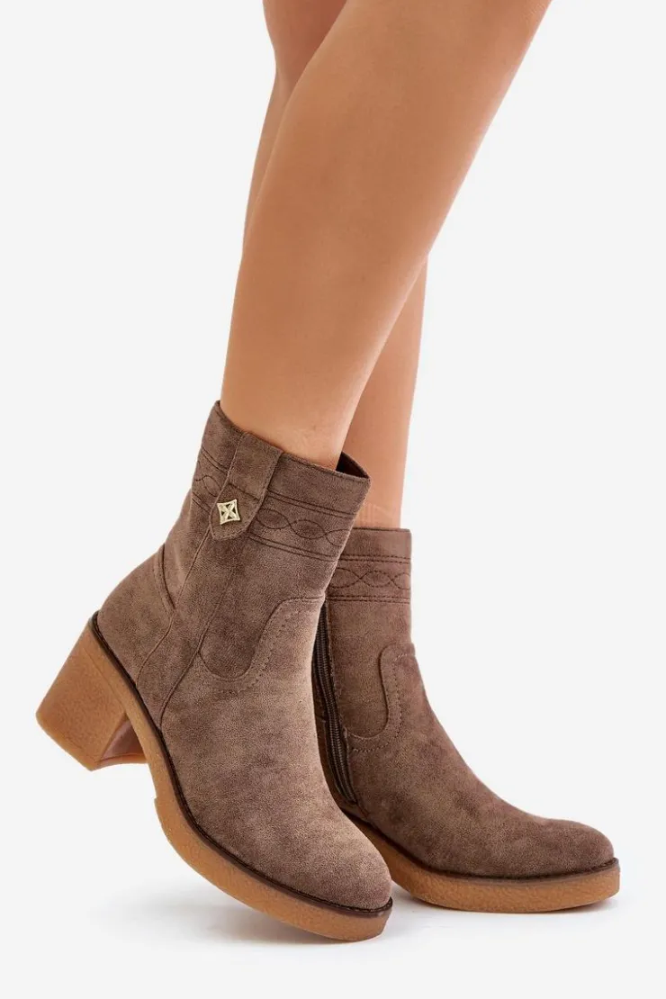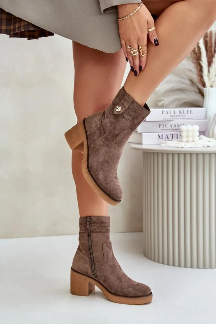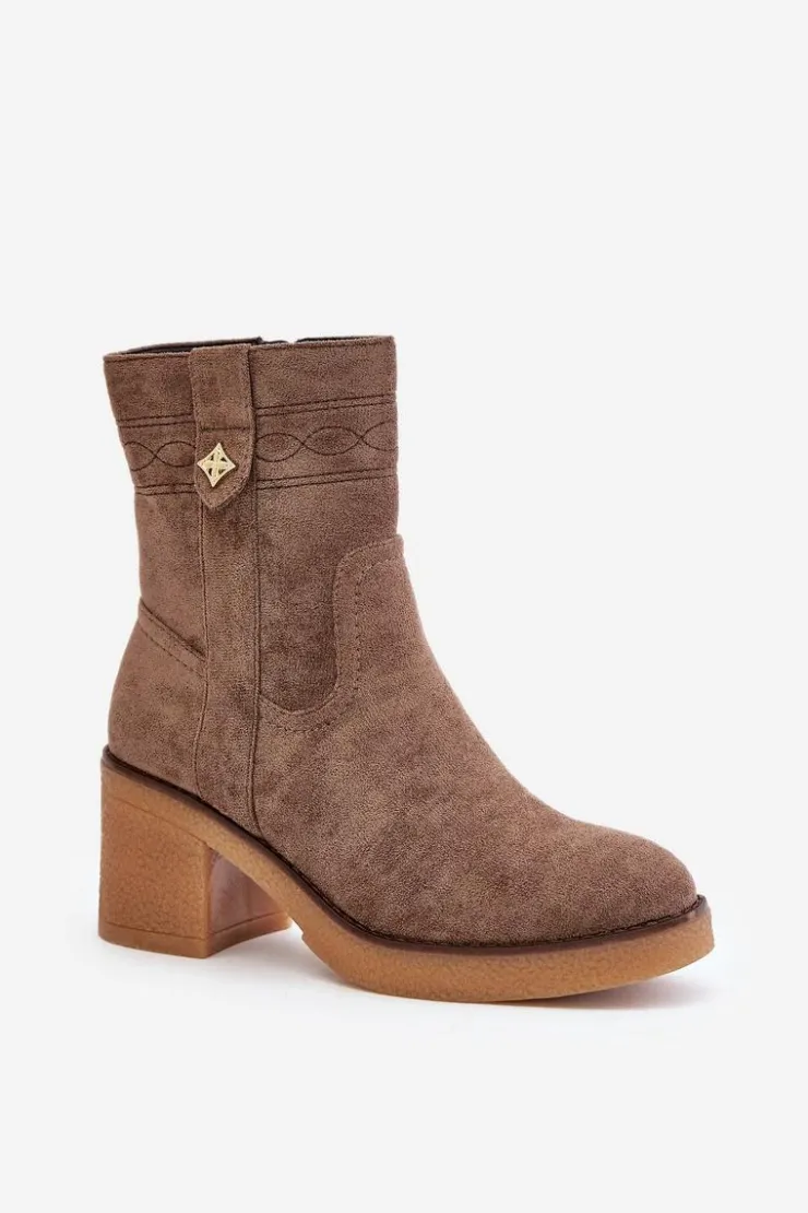 Klasyczne botki damskie wykonane z eko zamszu. Osadzone na obcasie w formie słupka. Noski zaokrąglone. Model ten wyróżnia się przeszyciami na cholewce oraz małym detalem. Wnętrze ocieplane miękkim kocem obuwniczym, idealne na chłodniejsze dni. Przy wyborze rozmiaru prosimy sugerować się tabelą rozmiarów.