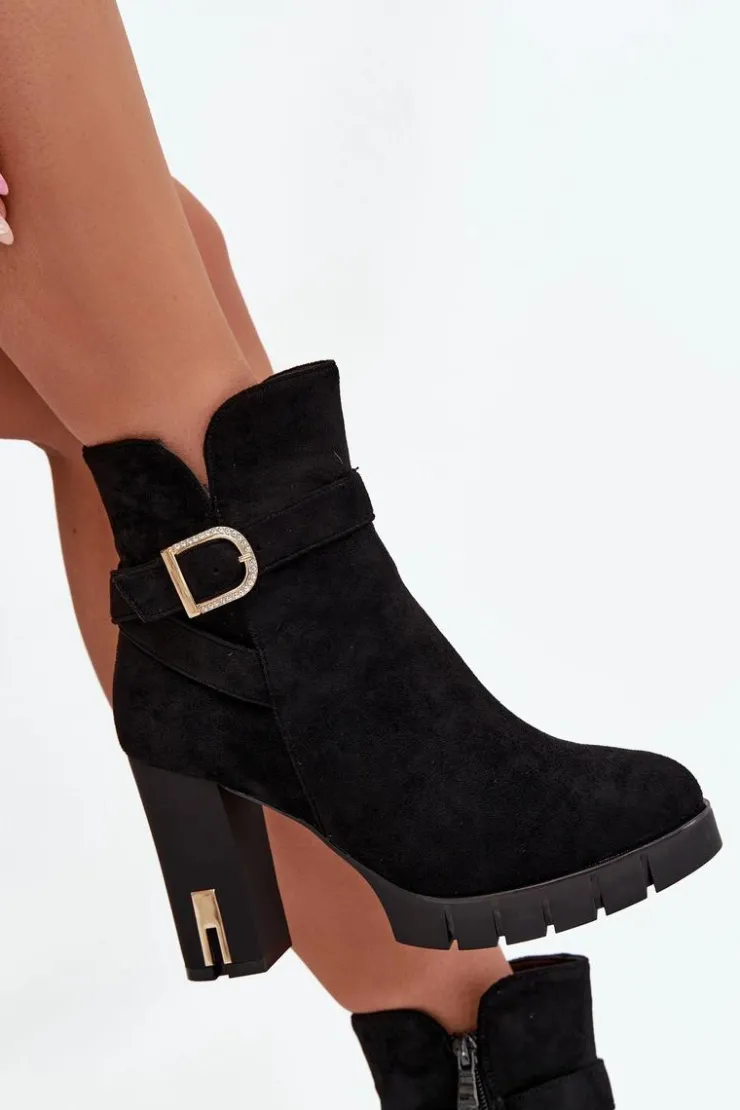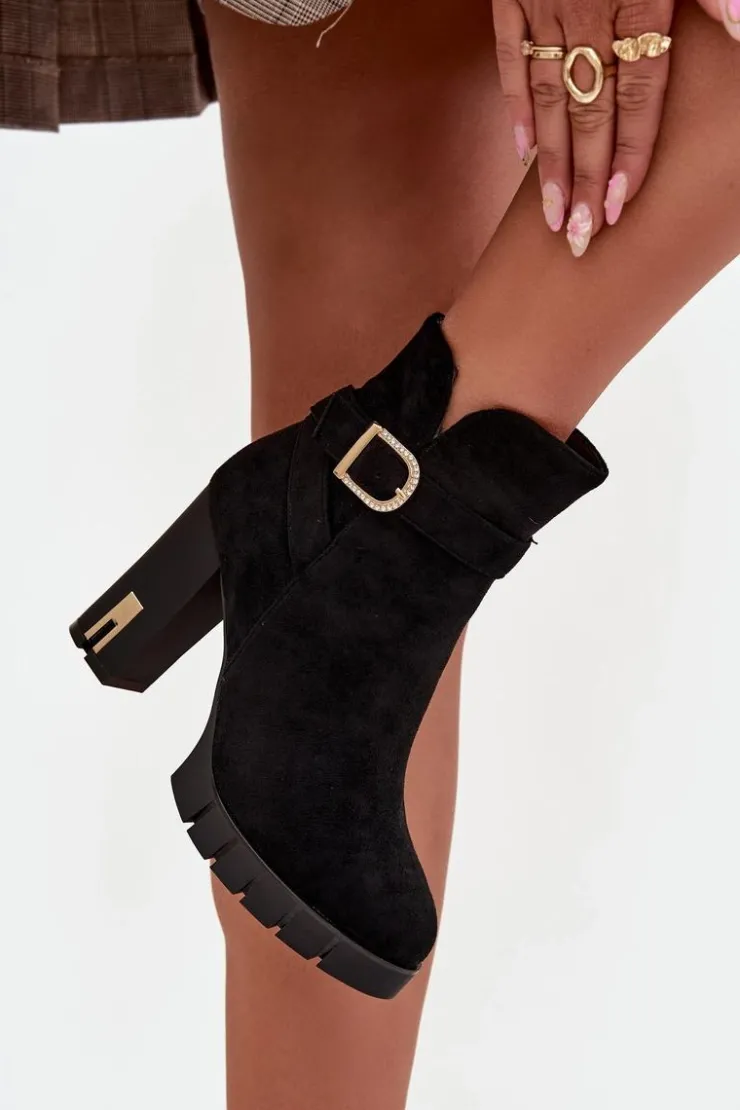 Botki damskie wykonane z eko zamszu. Wnętrze zostało ocieplone kocem obuwniczym, co zapewnia komfort termiczny i miękkość podczas noszenia. Buty są zapinane na zamek, dzięki czemu łatwo je zakładać i zdejmować. Dodatkowym atutem jest dekoracyjny pasek z klamrą, który nadaje im modnego charakteru i sprawia, że świetnie prezentują się w codziennych stylizacjach. To uniwersalny model, pasujący zarówno do spodni, jak i sukienek. Przy wyborze rozmiaru prosimy sugerować się tabelą rozmiarów.