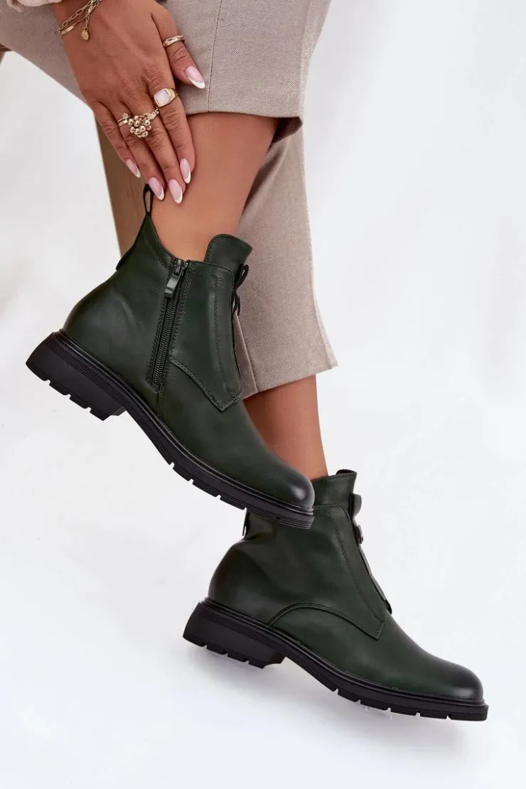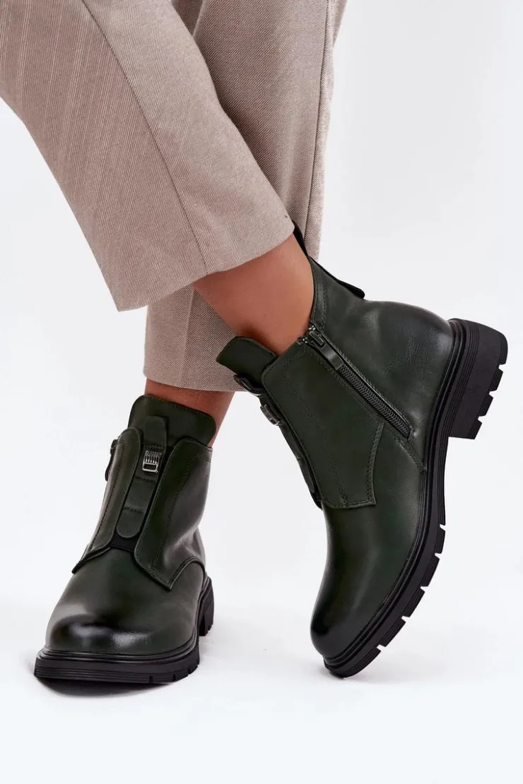 Botki damskie od marki Jezzi to praktyczne połączenie wygody i stylu na chłodniejsze dni. Wykonane z wysokiej jakości eko skóry, prezentują elegancki wygląd przy zachowaniu trwałości i łatwości w utrzymaniu. Osadzone na płaskim obcasie, zapewniają stabilny krok i komfort podczas codziennego noszenia. Model jest zapinany na zamek, co ułatwia szybkie zakładanie i dopasowanie do stopy. Wnętrze ocieplone, gwarantuje ciepło w chłodne dni, a subtelny, ozdobny detal z przodu cholewki dodaje charakteru i modnego akcentu, który wyróżnia je w codziennych stylizacjach. Idealne do casualowych zestawów, jak i do nieco bardziej eleganckich outfitów. Przy wyborze rozmiaru prosimy sugerować się tabelą rozmiarów.