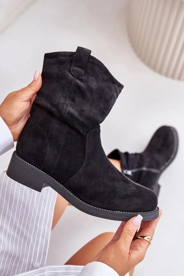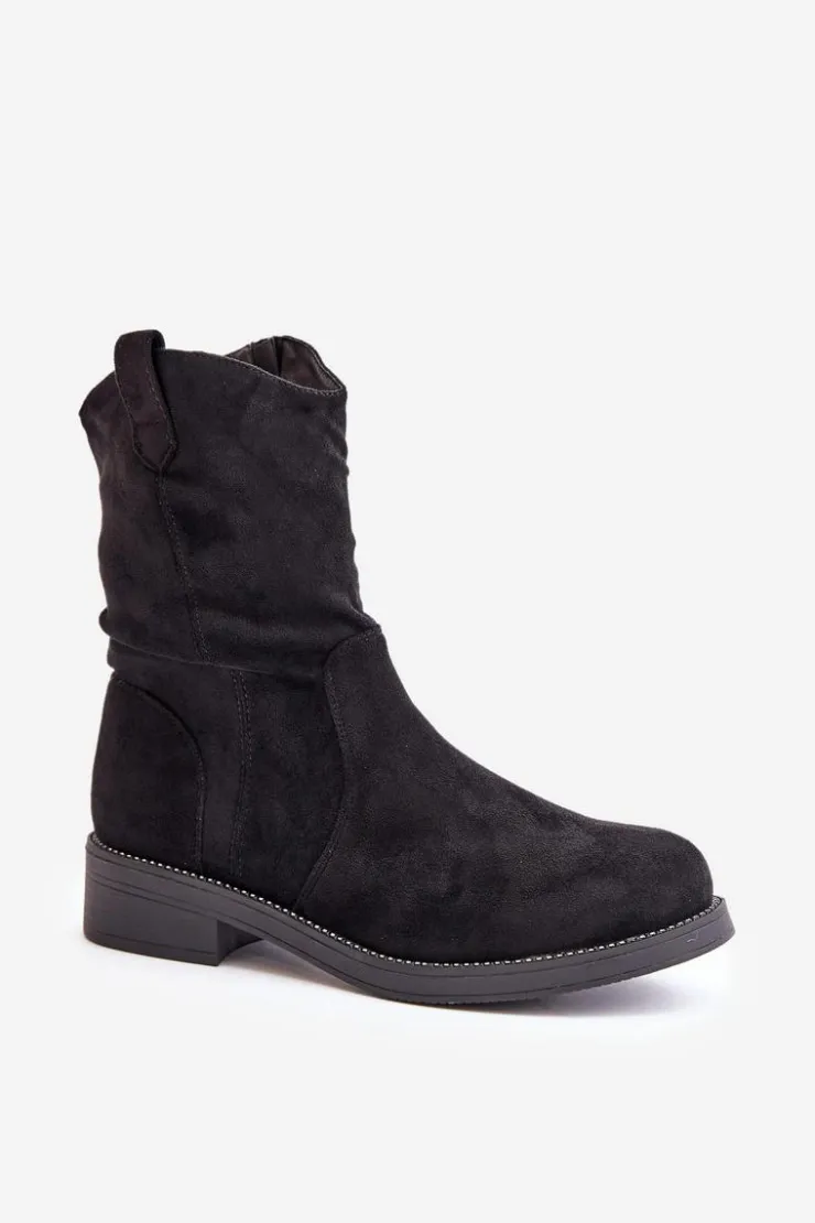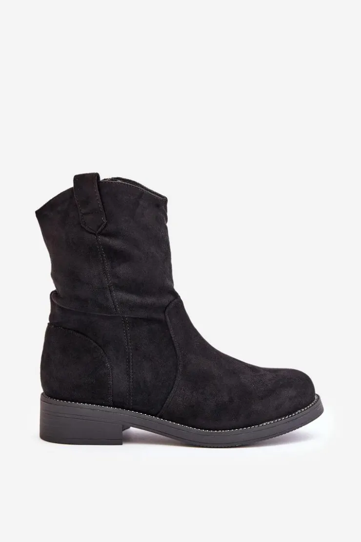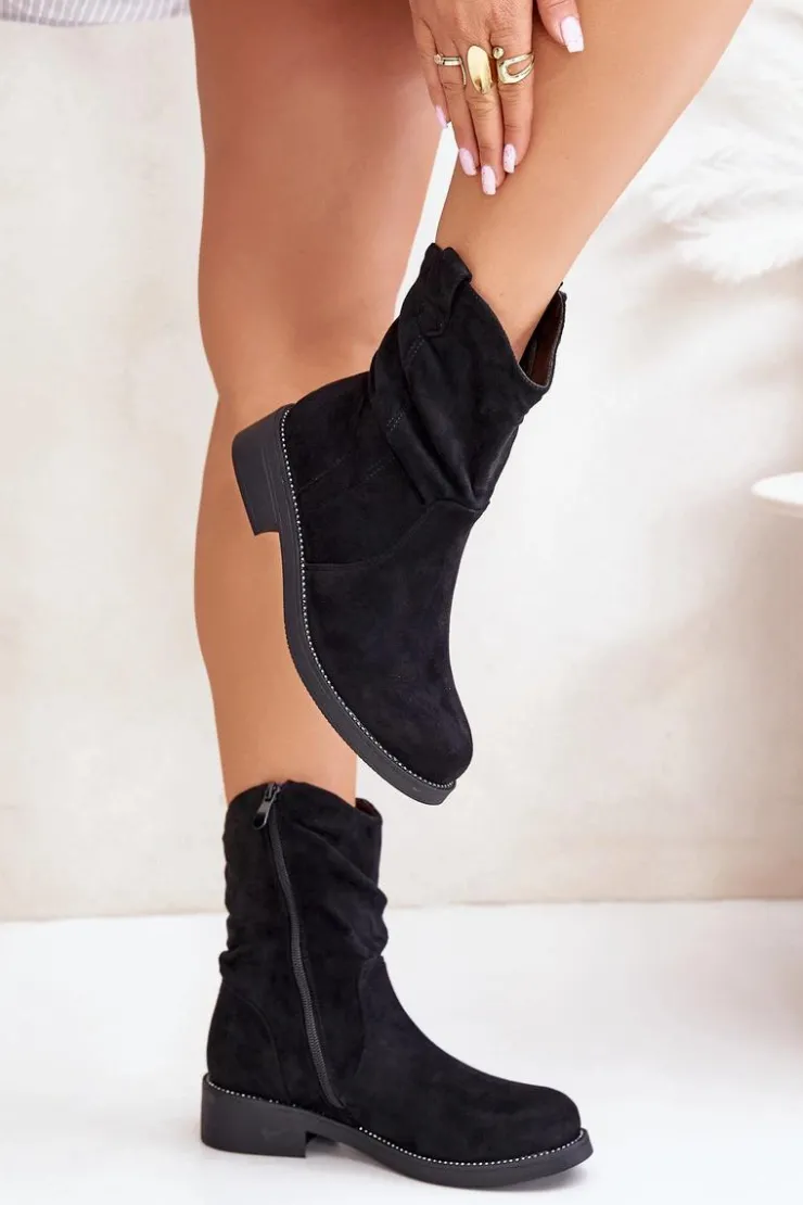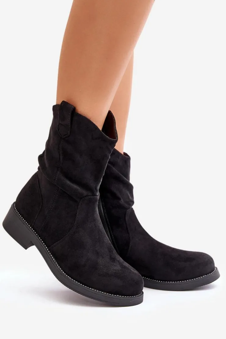 Damskie botki wykonane z eko zamszu. Osadzone na płaskim obcasie. Zapinane na zamek, co ułatwia zakładanie i zapewnia idealne dopasowanie. Zaokrąglone noski. Model ten wyróżnia się marszczeniem na cholewce oraz subtelne zdobienie przy podeszwie. Przy wyborze rozmiaru prosimy sugerować się tabelą rozmiarów.