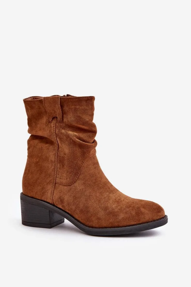 Klasyczne damskie botki wykonane z eko zamszu. Osadzone na niskim, stabilnym obcasie. Noski zaokrąglone. Zapinane na zamek. Model ten wyróżnia się marszczeniami na cholewce. Środek ocieplany kocem obuwniczym, co zapewni ciepło w chłodniejsze dni. Przy wyborze rozmiaru prosimy sugerować się tabelą rozmiarów.