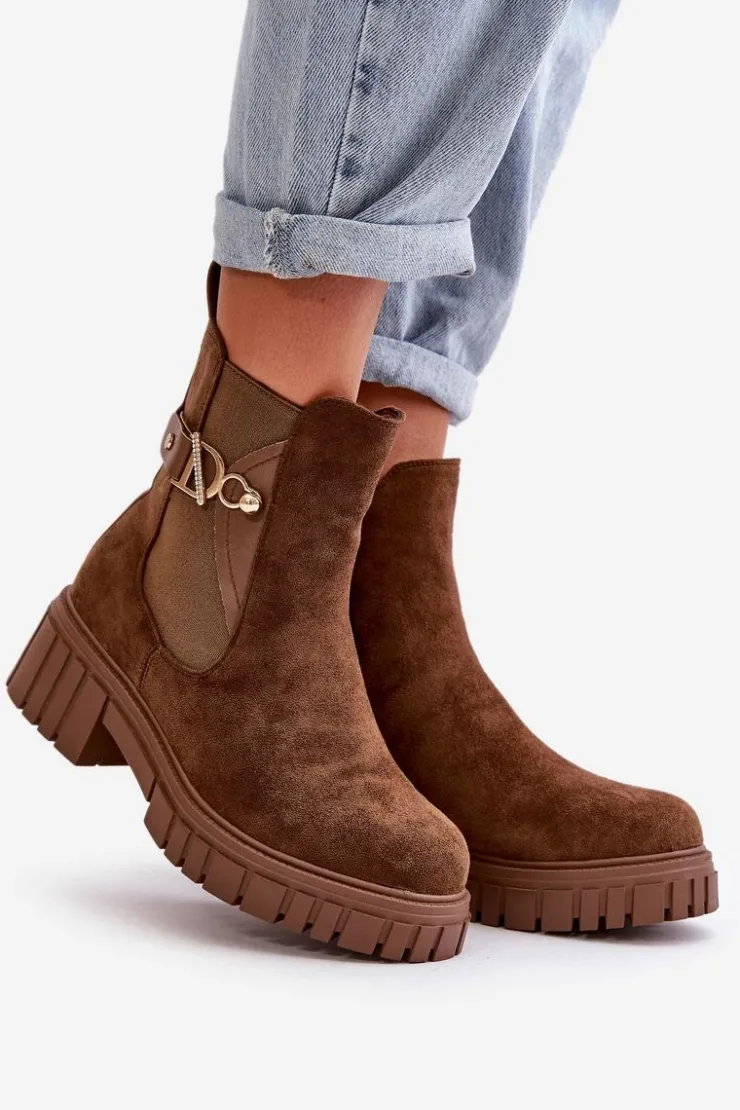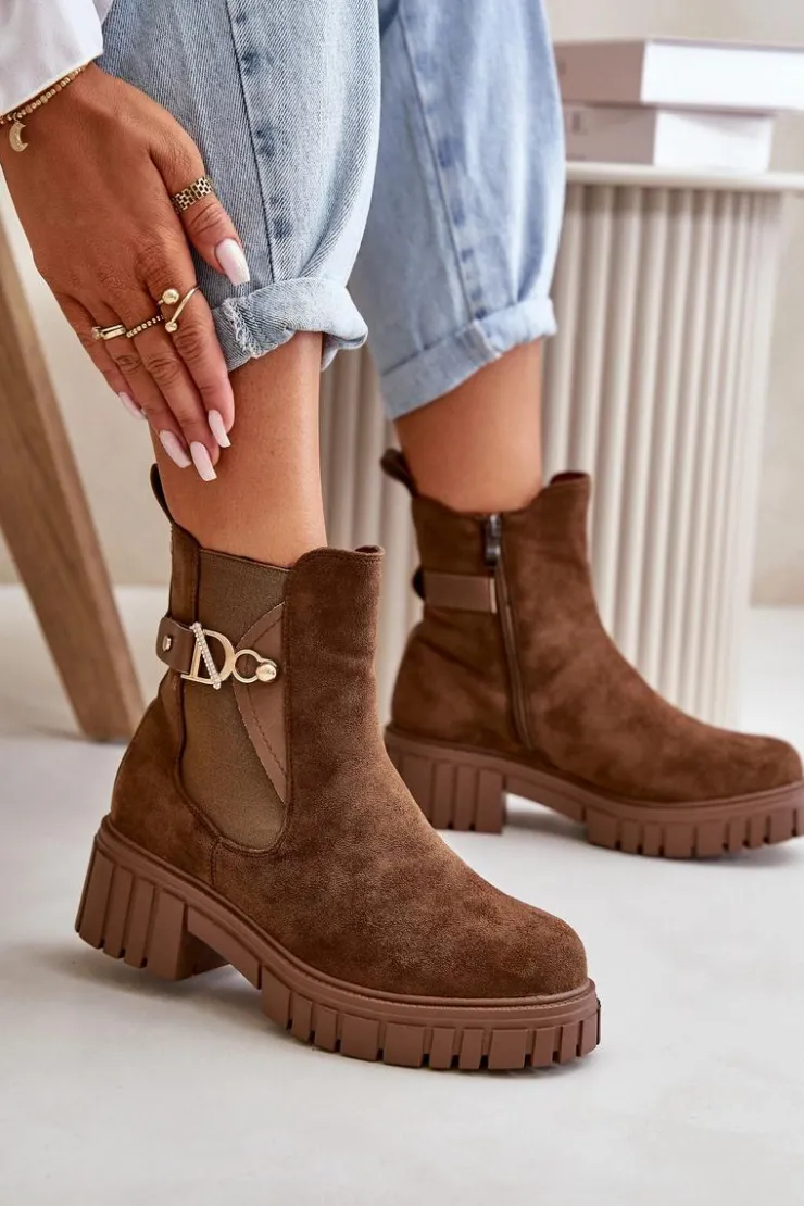 Botki damskie wykonane z miękkiego eko zamszu. Wnętrze ocieplone kocem obuwniczym sprawia, że są one doskonałym rozwiązaniem na chłodne dni. Wyróżniającym się elementem tego modelu jest złoty detal, który dodaje im wyjątkowego uroku i elegancji. Zapinanie na zamek ułatwia zakładanie i zdejmowanie obuwia. Doskonale sprawdzą się w połączeniu z różnymi elementami garderoby, od jeansów po eleganckie sukienki, podkreślając unikalny styl każdej kobiety. Przy wyborze rozmiaru prosimy sugerować się tabelą rozmiarów.