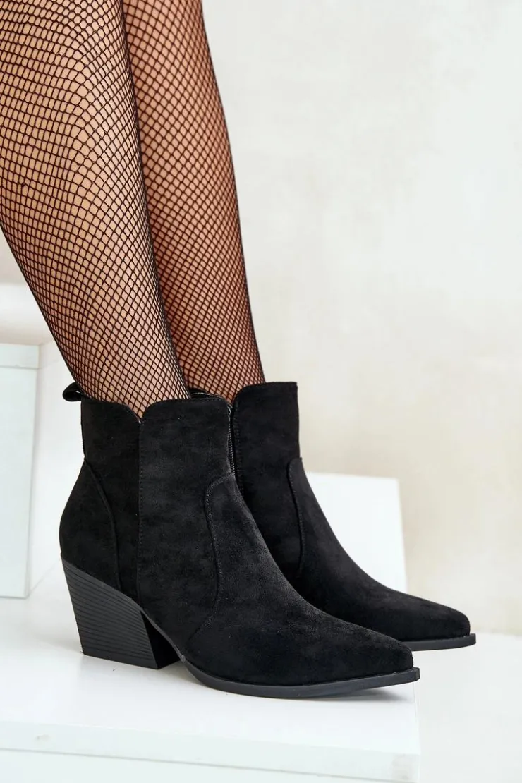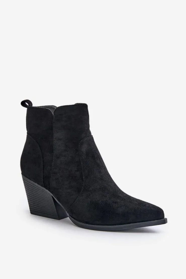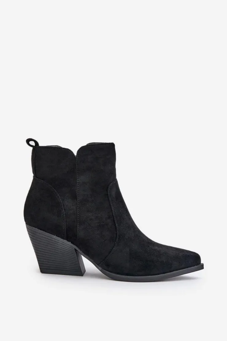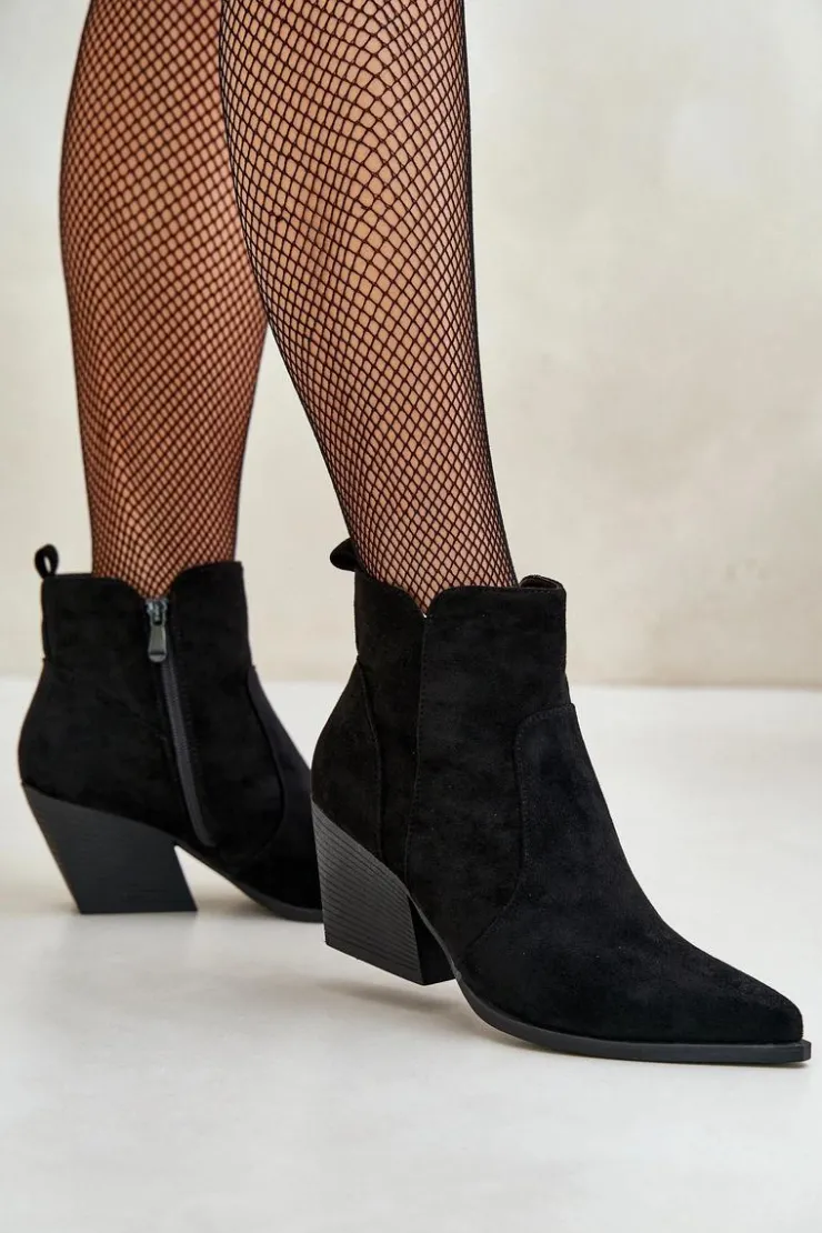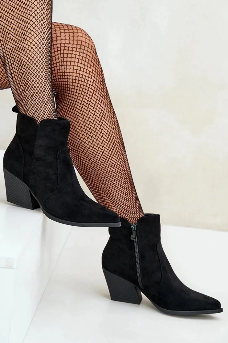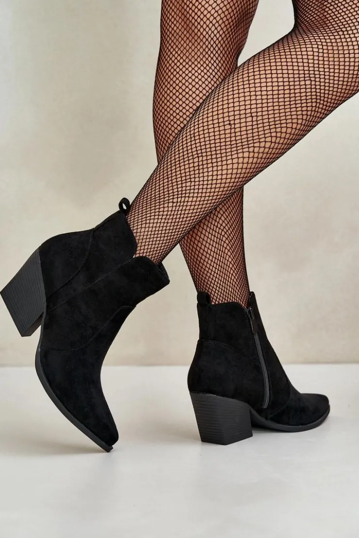 Botki w stylu kowbojek, wykonane z eko zamszu, to idealny wybór na chłodniejsze dni. Osadzone na stabilnym obcasie typu słupek, zapewniają komfort noszenia i elegancję. Szpiczaste noski optycznie wysmuklają nogi, dodając sylwetce lekkości. Wnętrze ocieplone kocem obuwniczym gwarantuje ciepło, a suwak ułatwia zakładanie i zdejmowanie butów. Idealne do jesiennych stylizacji. Przy wyborze rozmiaru prosimy sugerować się tabelą rozmiarów.