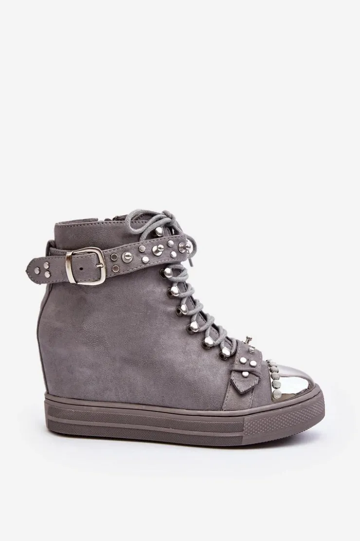 Wyjątkowe botki na koturnie z dżetami i klamrami. Buty wykonane są z eko zamszu, posiadają ocieplenie w postaci koca obuwniczego. Botki świetnie wpiszą się w stylizacje glam rock lub grunge. Koniecznie sprawdź całą naszą kolekcje damskich botków! Przy wyborze rozmiaru prosimy sugerować się tabelą rozmiarów.