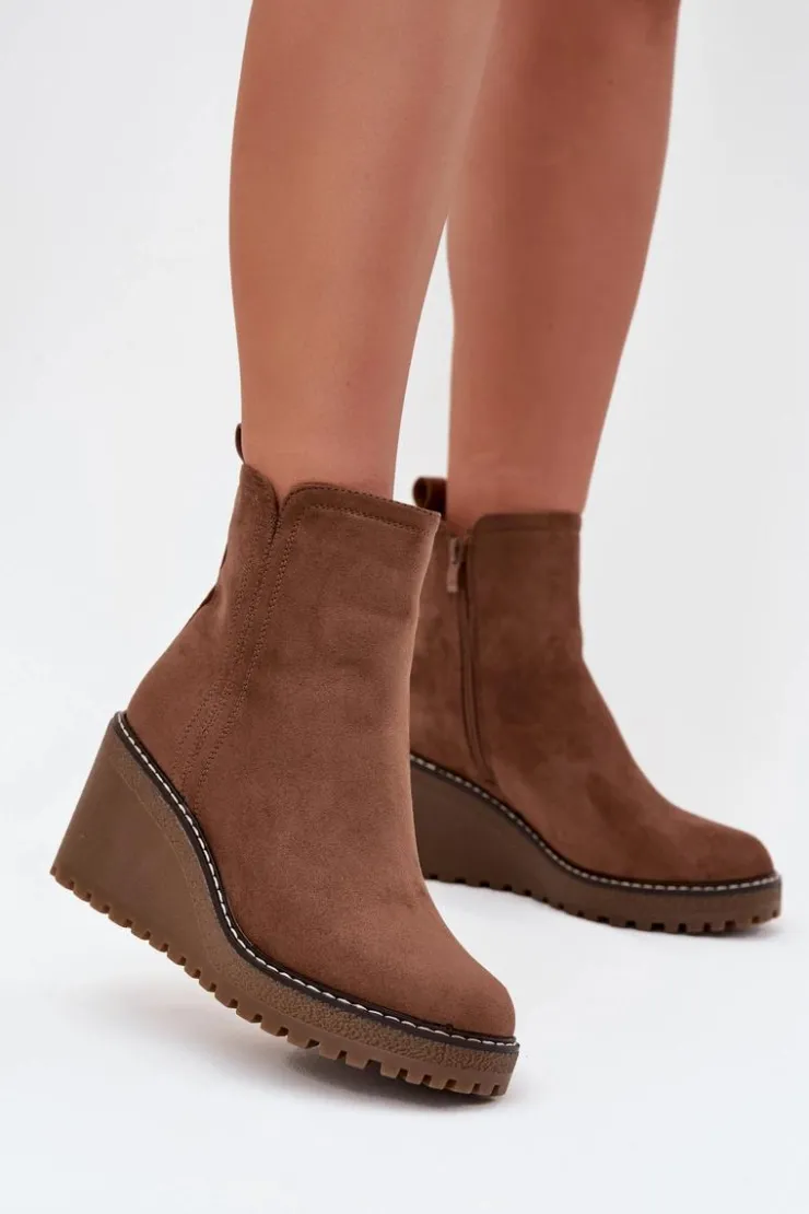 Botki damskie z eko zamszu na koturnie to elegancka i wygodna opcja na chłodniejsze dni. Ocieplane kocem obuwniczym, zapewniają ciepło, a zapinane na zamek ułatwiają zakładanie. Koturna dodaje kilku centymetrów wzrostu. Idealne na co dzień, te botki będą doskonałym uzupełnieniem zimowych stylizacji. Przy wyborze rozmiaru prosimy sugerować się tabelą rozmiarów.