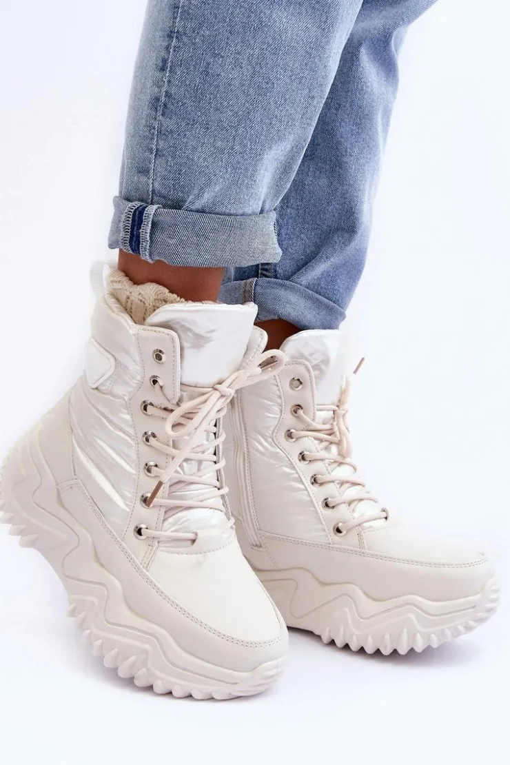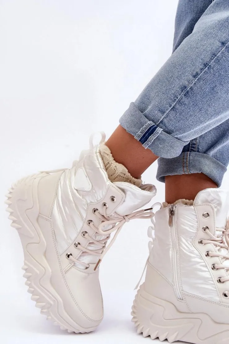 Botki damskie w sportowym stylu. Osadzone na masywnej platformie. Wewnątrz znajduje się ciepłe i miłe w dotyku futerko. Zapinane na suwak po wewnętrznej stronie cholewki oraz dodatkowo sznurowane. Buty idealnie sprawdzą się w zimowe dni! Przy wyborze rozmiaru prosimy sugerować się tabelą rozmiarów.