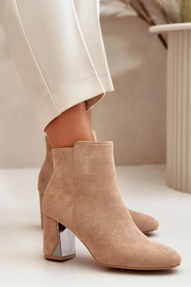 Botki damskie wykonane z eko zamszu. Osadzone na obcasie typu słupek wraz z lustrzanym elementem. Wnętrze ocieplone jest kocem obuwniczym, co zapewni ciepło w chłodniejsze dni. Zapinane na zamek. Noski zaokrąglone. Usztywniony zapiętek zwiększy stabilizację stopy. Przy wyborze rozmiaru prosimy sugerować się tabelą rozmiarów.