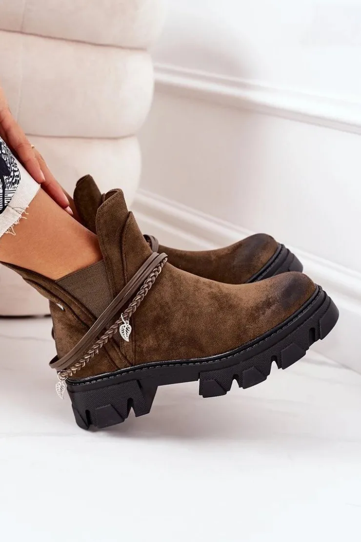 Sztyblety damskie wykonane z eko zamszu. Wnętrze botków ocieplone jest miłym w dotyku kocem obuwniczym. Dekoracyjne paski są odpinane. Przy wyborze rozmiaru prosimy sugerować się tabelą rozmiarów.