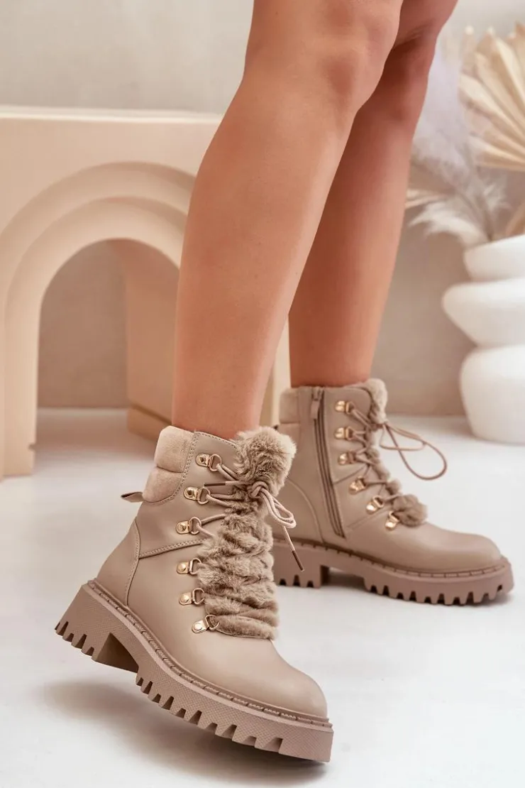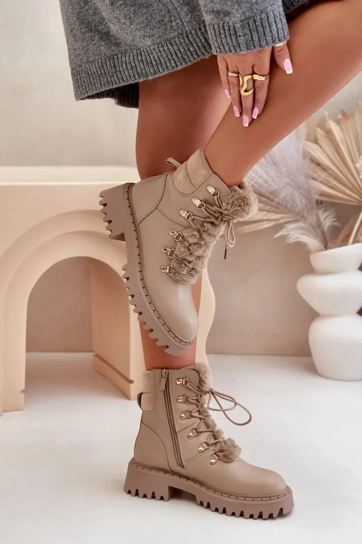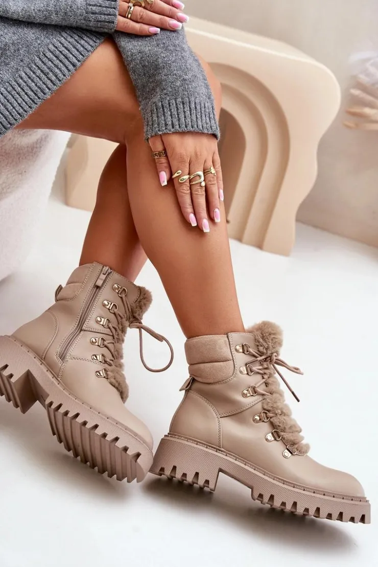 Damskie Boto Ocieplane Botki Trapery Na Zamek Z Eko Skóry Beżowe Willatta