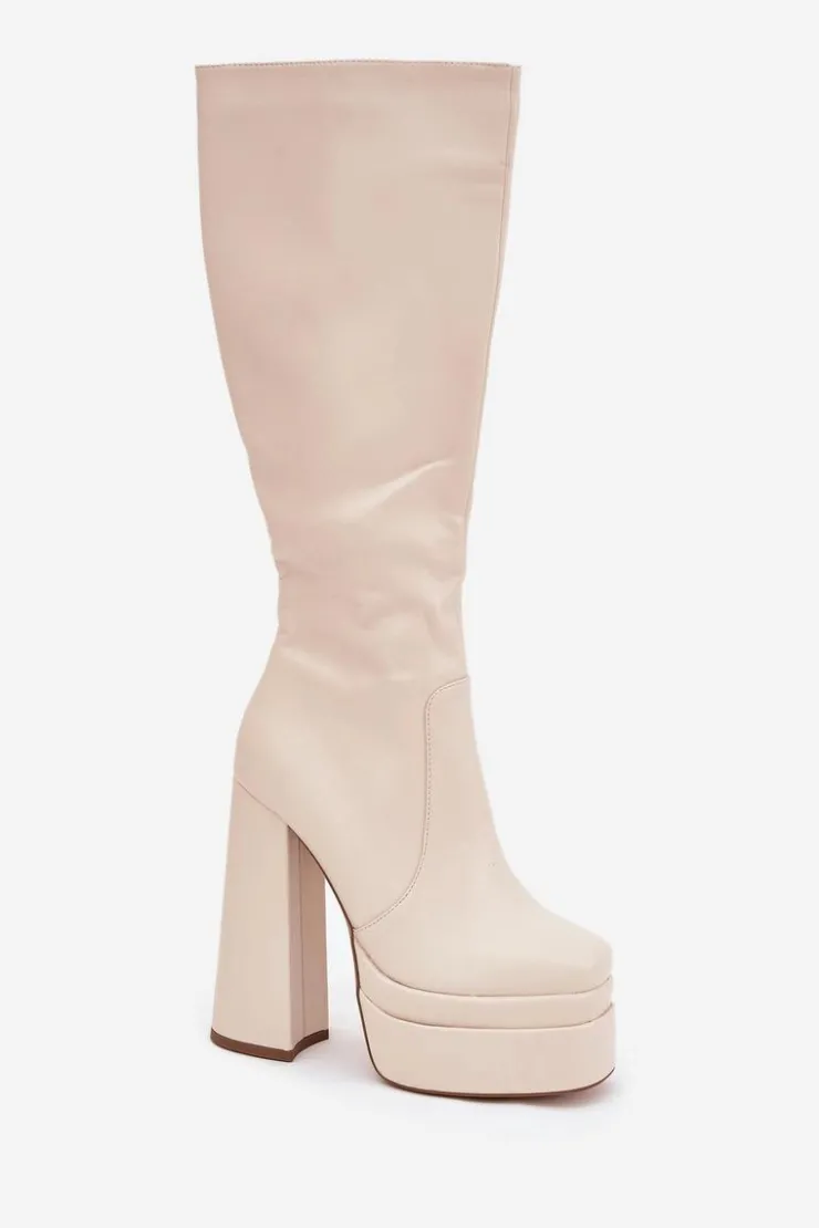 Kozaki damskie z eko skóry, osadzone na obcasie w formie słupka i platformie. Zapinane na zamek, zapewniają łatwość zakładania, a zaokrąglone noski dodają komfortu. Cholewka sięgająca do kolana, wraz z ociepleniem kocem obuwniczym, zapewnia ciepło i komfort nawet w chłodniejsze dni. Te kozaki doskonale komponują się z zimowymi stylizacjami. Przy wyborze rozmiaru prosimy sugerować się tabelą rozmiarów.