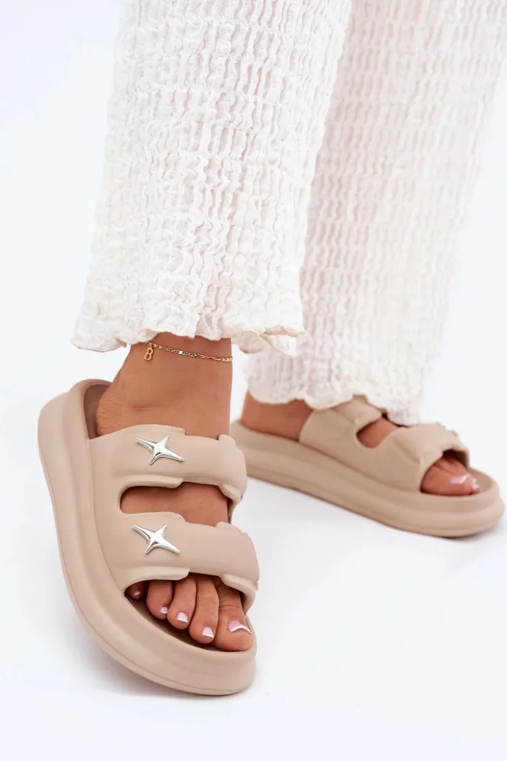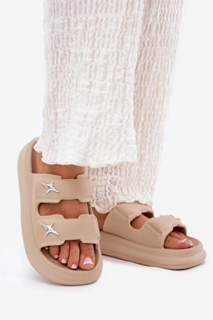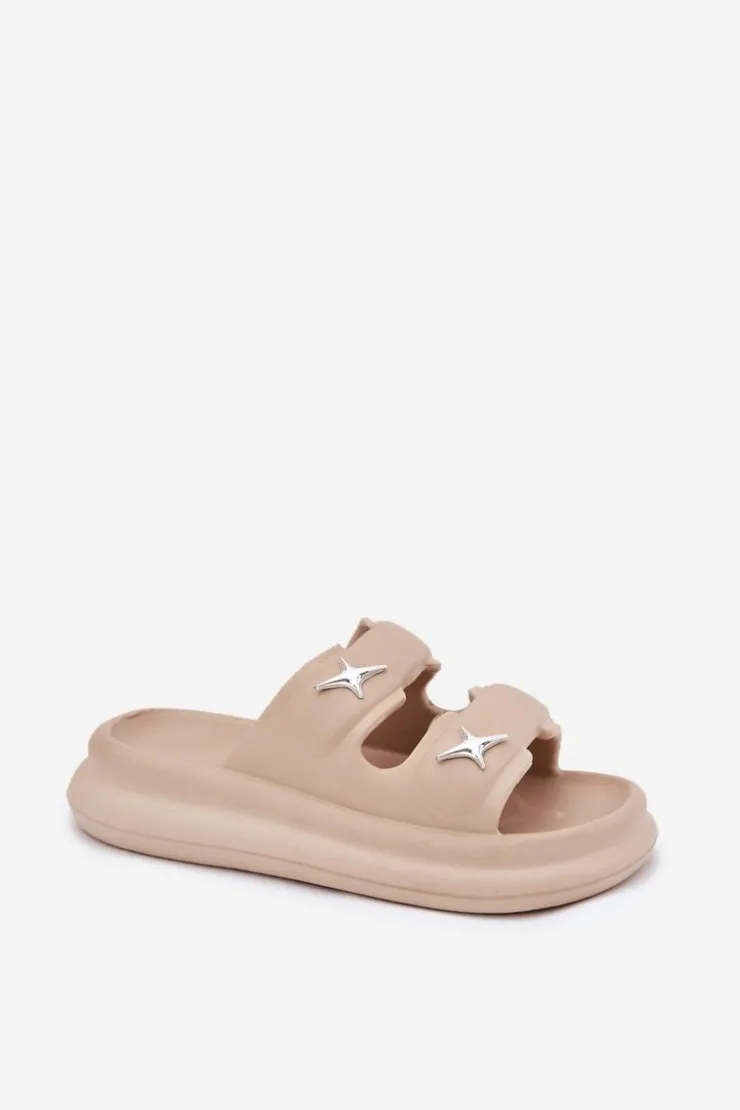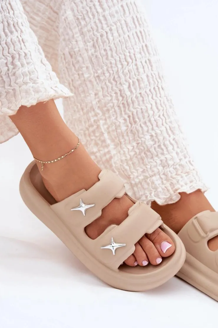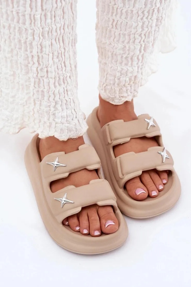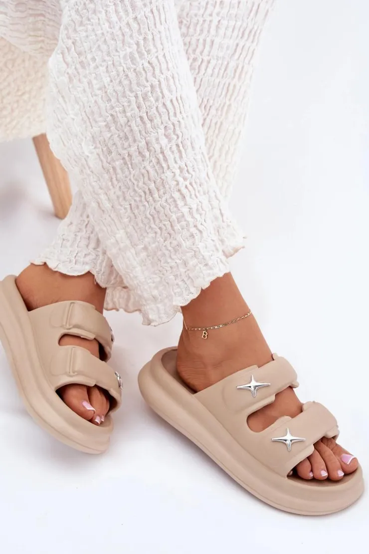 Klapki damskie z piankowego tworzywa, lekkie i osadzone na platformie, to doskonały wybór na ciepłe dni. Dwa paski ozdobione srebrnymi przypinkami dodają im modnego charakteru. Idealne na basen, codzienne wyjścia oraz wakacyjne wyjazdy. Przy wyborze rozmiaru prosimy sugerować się tabelą rozmiarów.