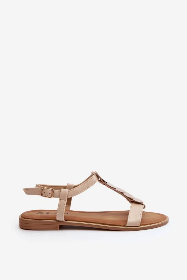 Płaskie sandały damskie wykonane z eko skóry. Ozdobione złotymi detalami. Zapinane na regulowany pasek ze sprzączką dla idealnego dopasowania. Model ten z pewnością dopasujesz do wielu stylizacji! Przy wyborze rozmiaru prosimy sugerować się tabelą rozmiarów.