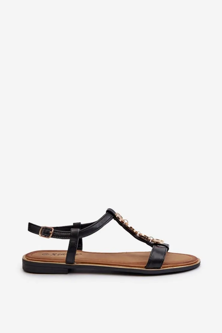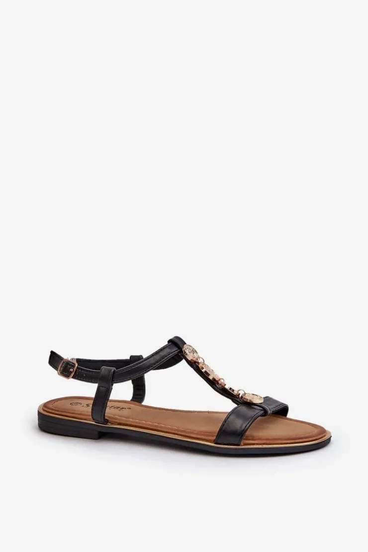 Sandały damskie z subtelnymi złotymi ozdobami. Wykonane z eko skóry. Osadzone na płaskim obcasie. Zapinane na regulowany pasek ze sprzączką, są zarówno modne, jak i wygodne. Idealne do codziennych stylizacji. Przy wyborze rozmiaru prosimy sugerować się tabelą rozmiarów.