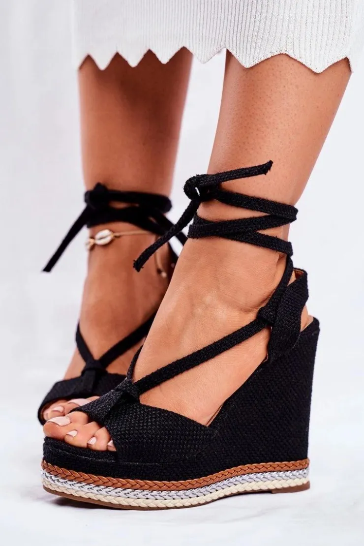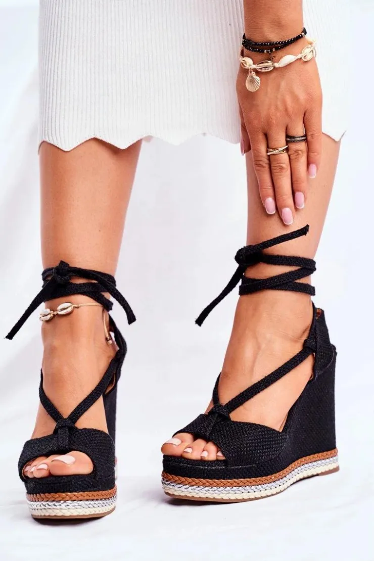 Damskie Boto Sandałki Damskie Na Koturnie Wiązane Czarne Sydney
