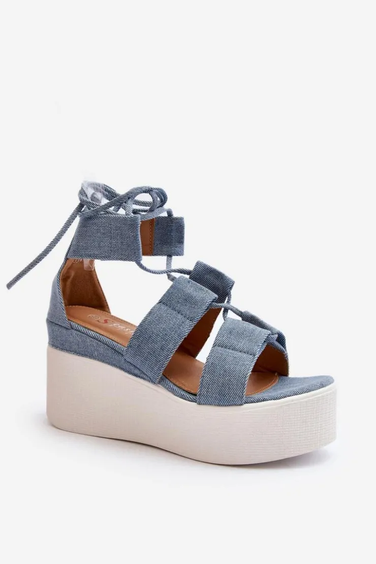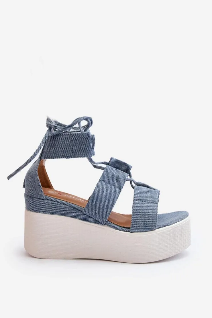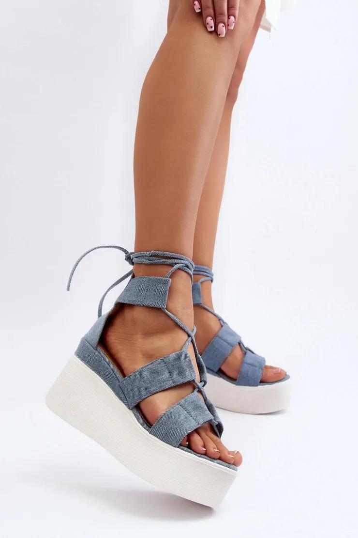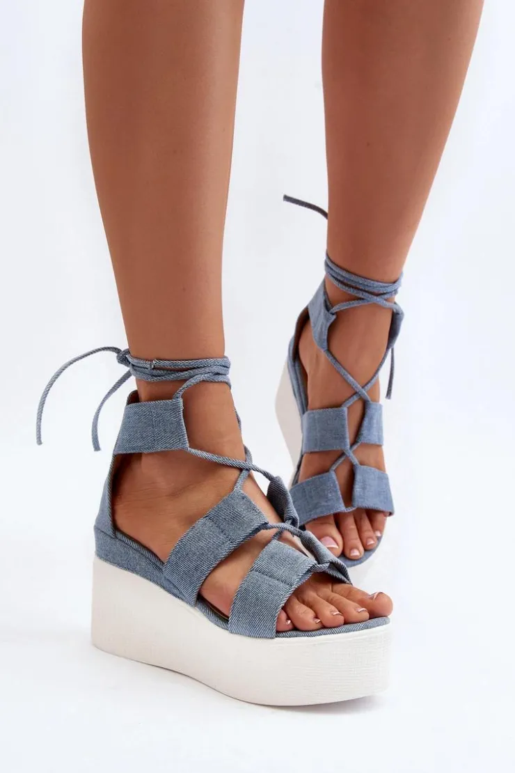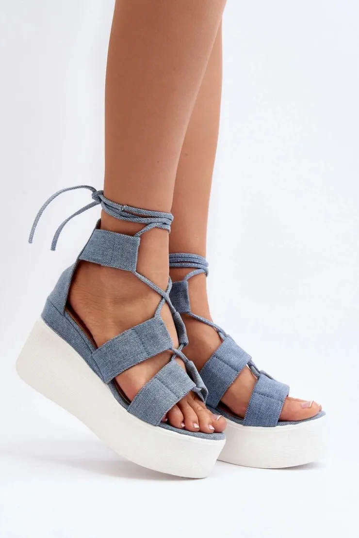 Sandały damskie osadzone na grubej platformie oraz koturnie. Wykonane z eko materiału tekstylnego. Model ten posiada modne wiązanie wokół kostki. Lekko profilowana wkładka z eko skóry zapewni wygodę podczas użytkowania. Fason ten dopasujesz do wielu stylizacji z letnimi sukienkami, spódnicami oraz spodniami! Przy wyborze rozmiaru prosimy sugerować się tabelą rozmiarów.