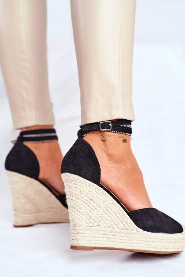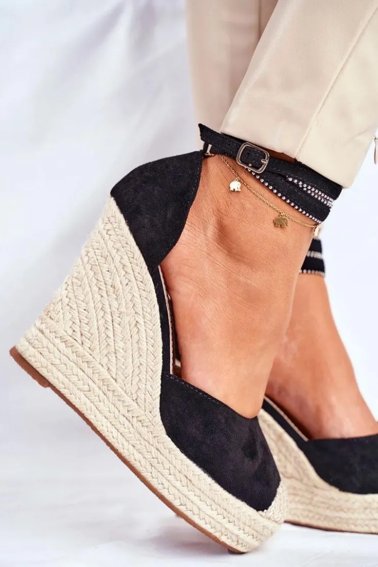 Damskie Boto Sandały Damskie Na Koturnie Lniane Czarne Canterola