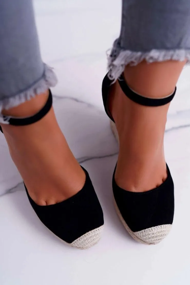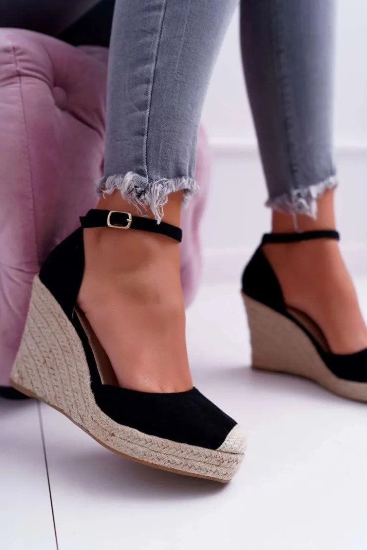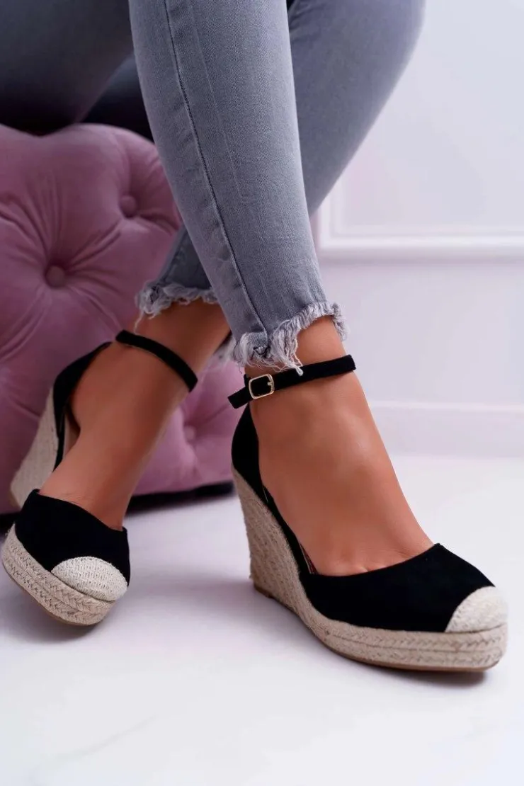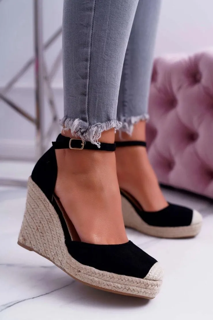 Damskie Boto Sandały Damskie Na Koturnie Lniane Czarne Tammaris