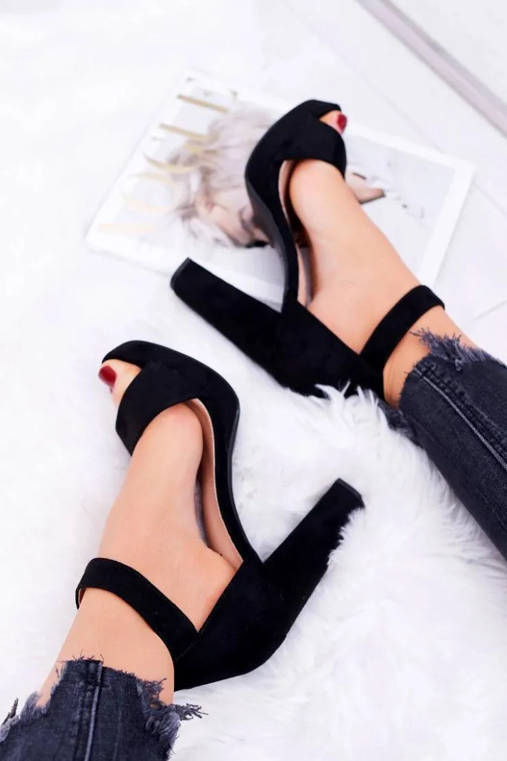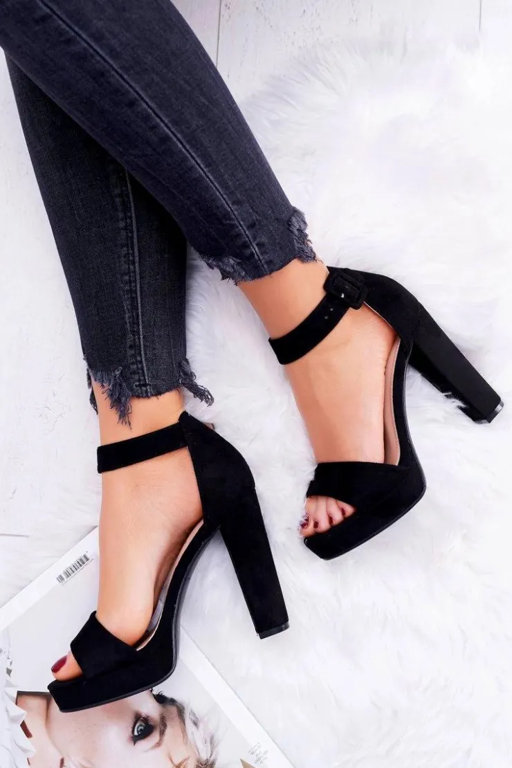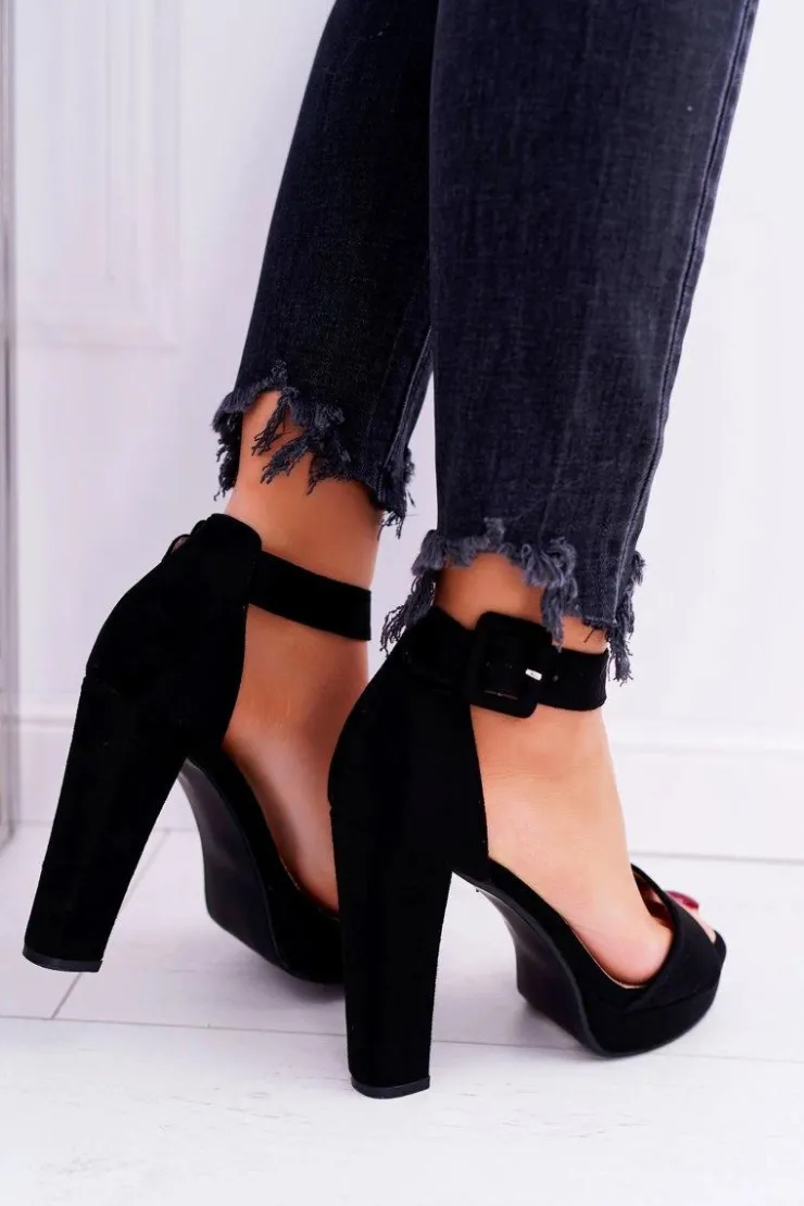 Wygodne, wysokie zamszowe sandały to marzenie każdej kobiety! Wysoki oraz stabilny słupek zapewni Ci gwarancję dobrego samopoczucia oraz gustownego wyglądu. Ekozamsz z którego zostały wykonane z pewnością sprawi, że zostaniesz zauważona! Model klasycznie zapinany delikatnym paskiem wokół kostki. Sandały wyróżniają się 2,5cm platformą. Już dziś wybierz naszą ofertę w doskonale niskiej cenie!