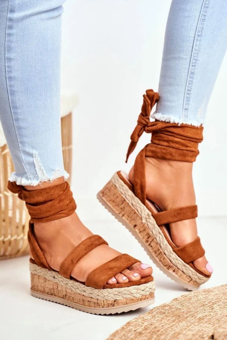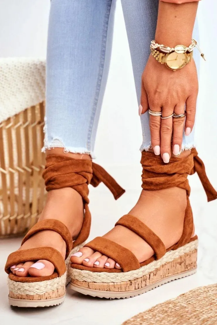 Damskie Boto Sandały Damskie Na Platformie Wiązane Camel La Favorite