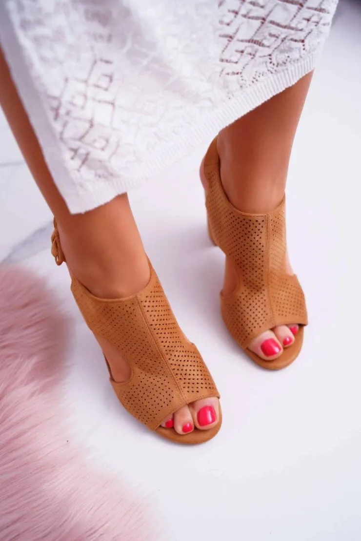 Damskie Boto Sandały Damskie Na Słupku Ażurowe Zamszowe Camel HiBaby