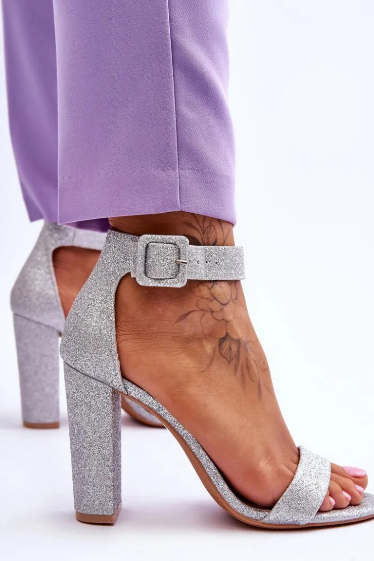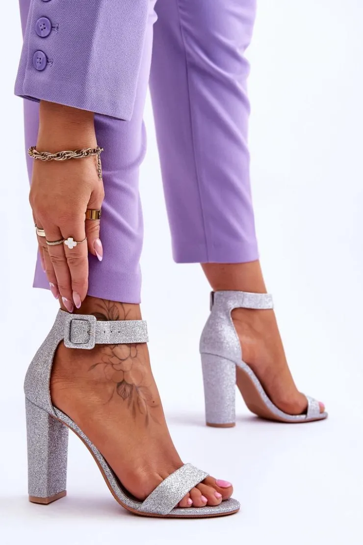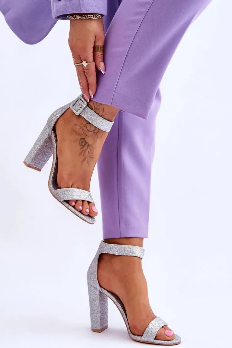 Jeśli znudziły Ci się klasyczne zamszowe sandały na słupku, koniecznie zobacz co dla Ciebie mamy! Przepięknie mieniące się sandały na wysokim słupku. W całości pokryte pięknie mieniącym się brokatem. Zapinane wokół kostki. Przy wyborze rozmiaru prosimy kierować się tabelą rozmiarów