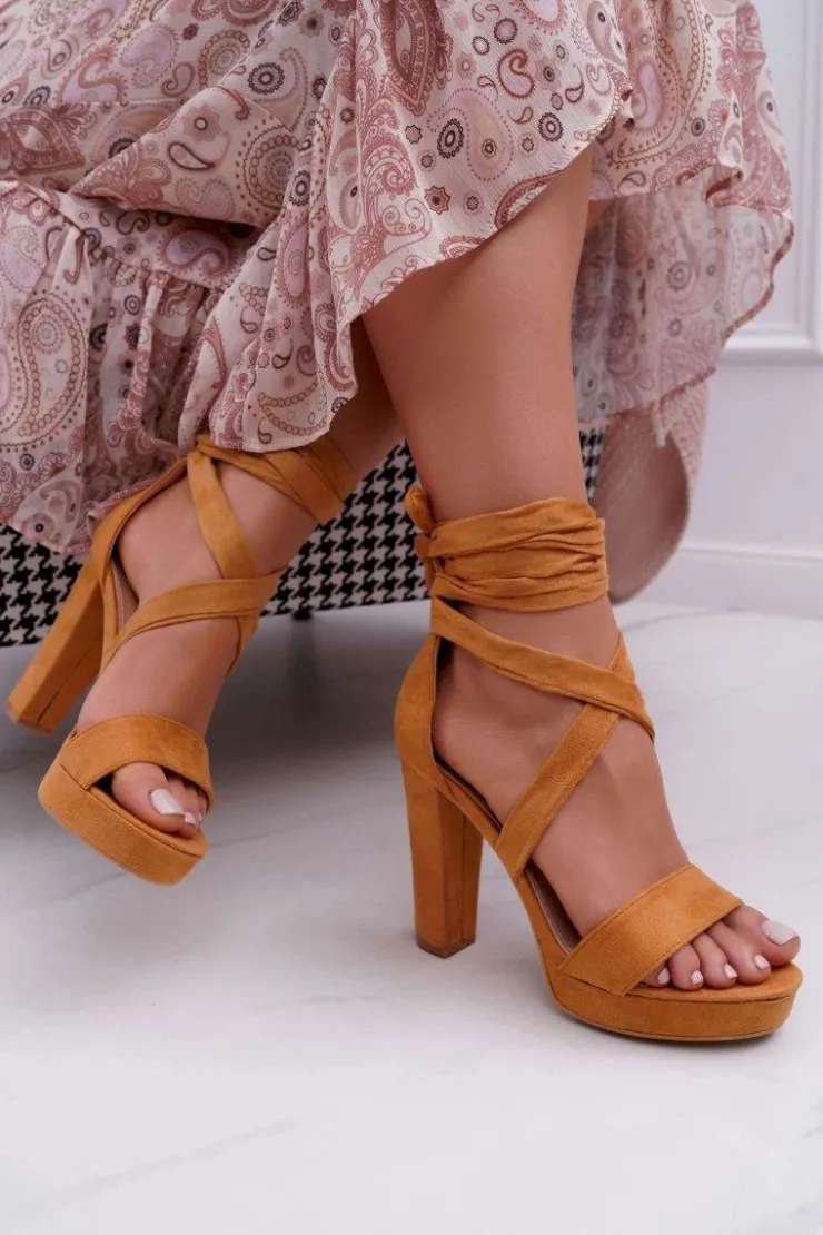 Wiązane sandały zostały wykonane z przyjemnego w dotyku eko zamszu. Posiadają wysoki obcas w postaci słupka oraz platformę. Wkładka jest delikatnie profilowana, wykonana z eko skóry. Model ze skrzyżowanymi paskami na środku. Buty można wiązać na kilka sposobów np.: przy kostce czy na całości łydki. Nosek odkryty, zaokrąglony. Zapiętek delikatnie usztywniony. Koniecznie powinnaś je mieć w swojej garderobie! Przy wyborze rozmiaru prosimy sugerować się tabelą rozmiarów.