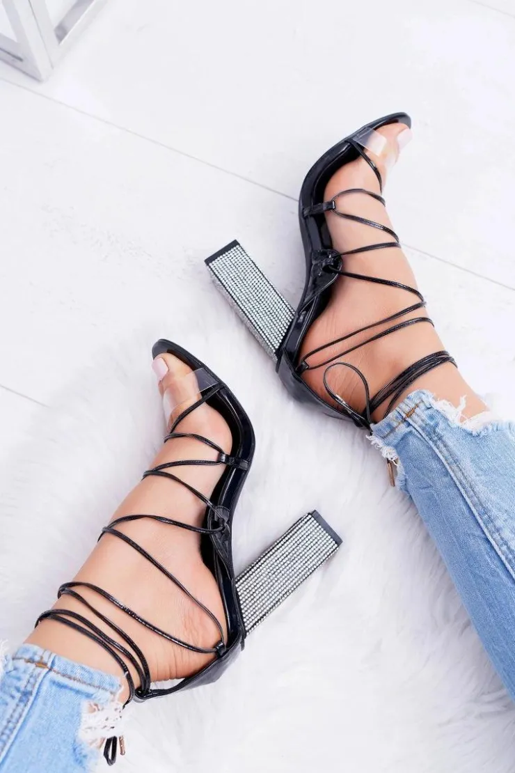 Damskie Boto Sandały Damskie Na Słupku Z Cyrkoniami Wiązane Czarne Everything