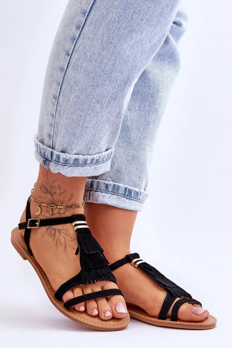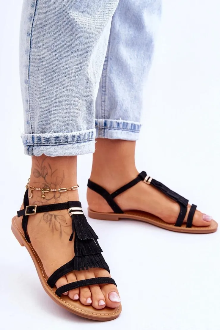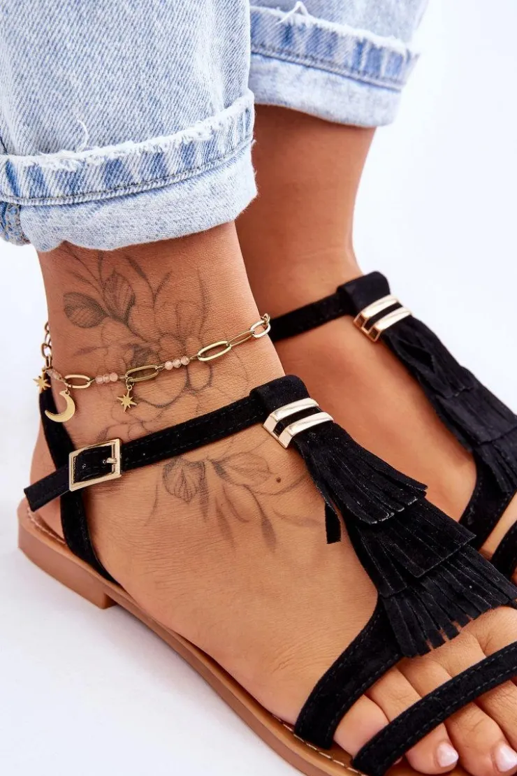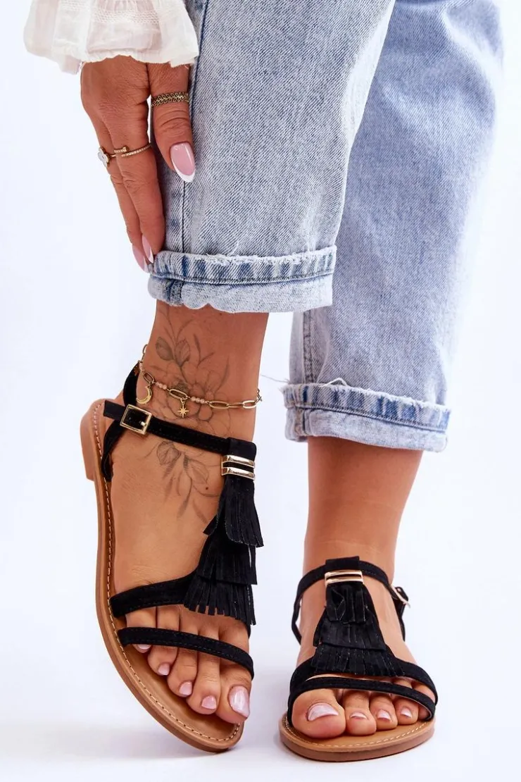 Damskie Boto Sandały Damskie Płaskie Zamszowe Boho Czarne Lucami