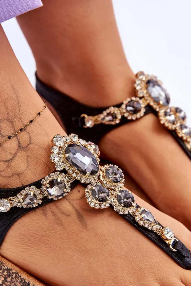 Damskie, eleganckie sandałki w stylu japonek świetnie sprawdzą się podczas upalnych dni. Model ten posiada na paseczkach zdobienia w postaci kamieni oraz dżetów imitujących cyrkonie. Sandałki są zapinane na regulowany pasek ze sprzączką. Miękka, eko zamszowa wkładka zapewni Ci wygodę. Dodatkowo jest profilowana. Przy wyborze rozmiaru prosimy kierować się tabelą rozmiarów.