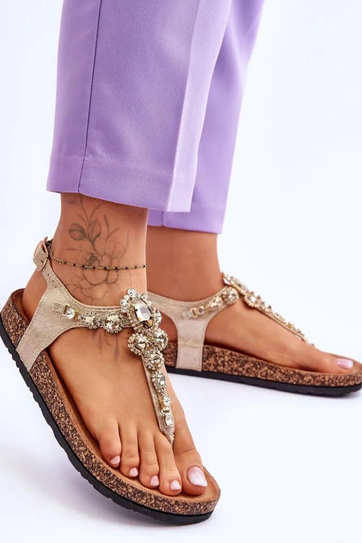 Damskie, eleganckie sandałki w stylu japonek świetnie sprawdzą się podczas upalnych dni. Model ten posiada na paseczkach zdobienia w postaci kamieni oraz dżetów imitujących cyrkonie. Sandałki są zapinane na regulowany pasek ze sprzączką. Miękka, eko zamszowa wkładka zapewni Ci wygodę. Dodatkowo jest profilowana. Przy wyborze rozmiaru prosimy kierować się tabelą rozmiarów.